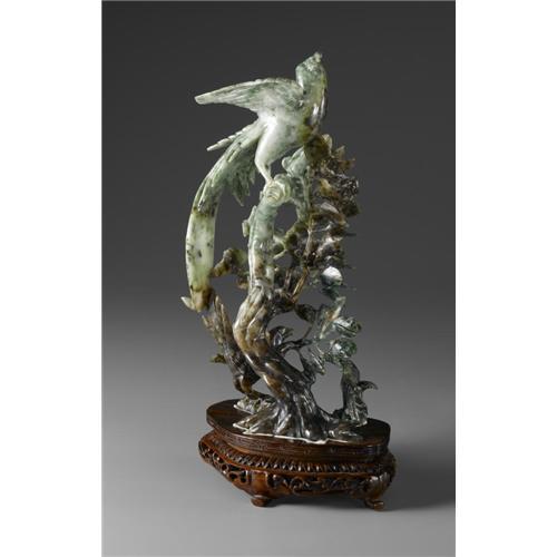 <B>CHINESE CARVED JADE/HARDSTONE GROUP</B></I><BR><BR>Chinese carved jade/hardstone openwork group, depicting a phoenix and two birds amid blossoming vines and branches. Of mottled green and brown coloration. On a wood stand<BR>10in. high x 5in. wide<BR><BR> <B>Condition Report:</B> Losses to phoenix.<BR><BR><b>Shipping:</b> Miscellaneous Collectibles, Larg (<a target="_blank" href="http://www.heritageauctions.com/common/shipping.php">view shipping information</a>)