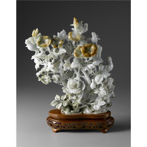 <B>CHINESE CARVED JADE/HARDSTONE GROUP</B></I><BR><BR>Chinese carved jade/hardstone openwork group, depicting phoenix and birds amid blossoming vines. Of pale green coloration with rust suffusions. On a wood stand<BR>10.5in. high x 9in. wide<BR><BR> <B>Condition Report:</B> Minor loss to beak of bird.<BR><BR><b>Shipping:</b> Miscellaneous Collectibles, Larg (<a target="_blank" href="http://www.heritageauctions.com/common/shipping.php">view shipping information</a>)