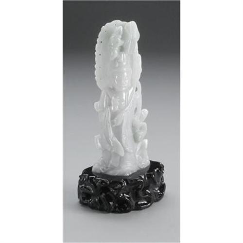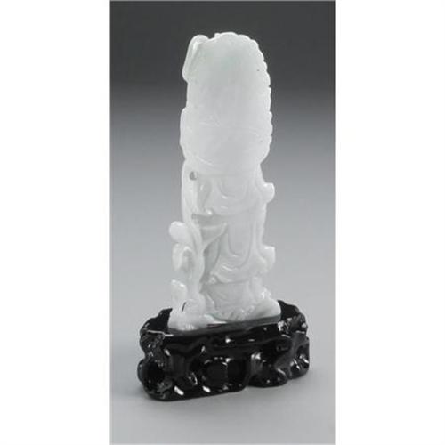 <B>CHINESE CARVED JADE/HARDSTONE FIGURE</B></I><BR><BR>Chinese carved jade/hardstone translucent openwork figure of a guanyin with a flaming mandorla, holding a lotus and standing on a rock amid waves. Of white and pale green coloration. On a wood stand<BR>6-3/8in. high<BR><BR> <B>Condition Report:</B> Normal signs of wear as appropriate with age.<BR><BR><b>Shipping:</b> Miscellaneous Collectibles, Larg (<a target="_blank" href="http://www.heritageauctions.com/common/shipping.php">view shipping information</a>)