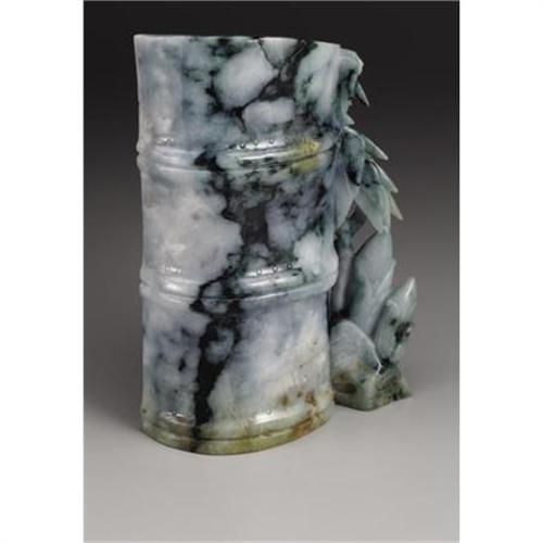 <B>CHINESE CARVED JADE/HARDSTONE GROUP</B></I><BR><BR>Chinese well-carved jade/hardstone openwork group depicting a bamboo section and stalks, with two phoenix, one in flight and the other perched next to foliage on a bank. Of mottled green coloration<BR>7-3/4in. high<BR><BR> <B>Condition Report:</B> Two tiny chips, loss to one bamboo stalk, old repair.<BR><BR><b>Shipping:</b> Miscellaneous Collectibles, Larg (<a target="_blank" href="http://www.heritageauctions.com/common/shipping.php">view shipping information</a>)