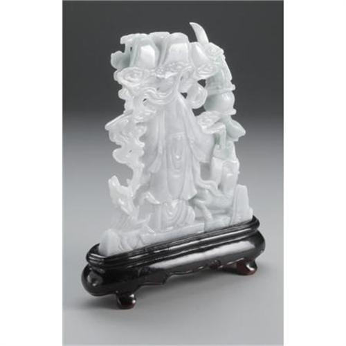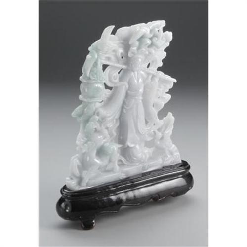 <B>CHINESE CARVED JADE/HARDSTONE OPENWORK GROUP</B></I><BR><BR>Chinese carved jade/hardstone translucent openwork group of a celestial beauty with flowing robes, carrying a basket of flowers, flanked by a deer and cranes, all on rockery. Of pale and bright green coloration. On a wood stand<BR>7-1/2in. high<BR><BR> <B>Condition Report:</B> Normal signs of wear as appropriate with age.<BR><BR><b>Shipping:</b> Miscellaneous Collectibles, Larg (<a target="_blank" href="http://www.heritageauctions.com/common/shipping.php">view shipping information</a>)