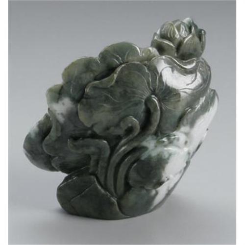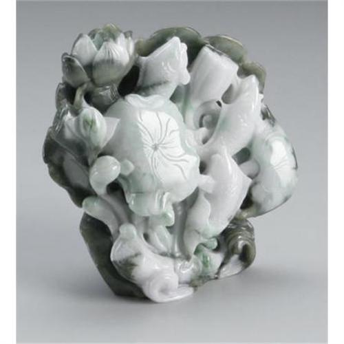 <B>CHINESE CARVED JADE/HARDSTONE GROUP</B></I><BR><BR>Chinese carved jade/hardstone openwork group depicting a carp amid waves and lotus. Of white, bright green, and spinach green coloration<BR>4.5in. high<BR><BR> <B>Condition Report:</B> Normal signs of wear as appropriate with age.<BR><BR><b>Shipping:</b> Miscellaneous Collectibles, Larg (<a target="_blank" href="http://www.heritageauctions.com/common/shipping.php">view shipping information</a>)
