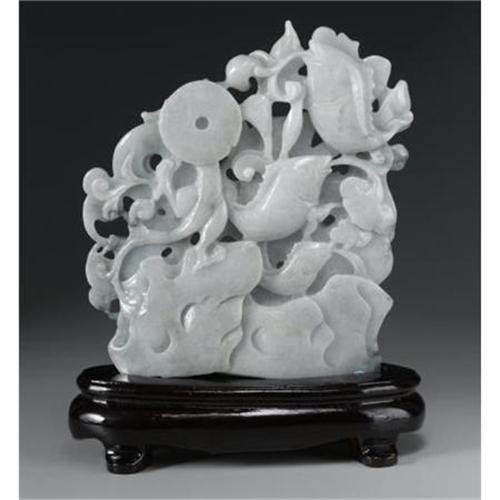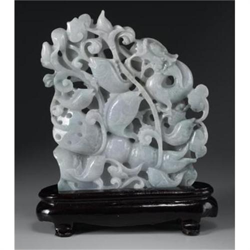 <B>CHINESE CARVED JADE/HARDSTONE GROUP</B></I><BR><BR>Chinese carved jade/hardstone openwork group of carp and dragon amid lotus and waves. Of pale green mottled coloration. On a wood stand<BR>7in. high<BR><BR> <B>Condition Report:</B> Normal signs of wear as appropriate with age.<BR><BR><b>Shipping:</b> Miscellaneous Collectibles, Larg (<a target="_blank" href="http://www.heritageauctions.com/common/shipping.php">view shipping information</a>)