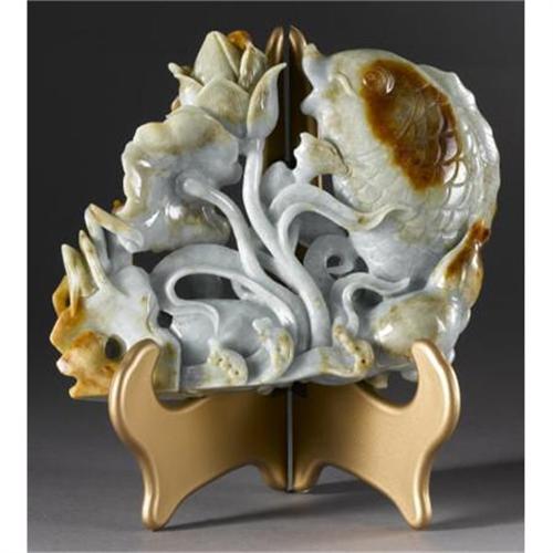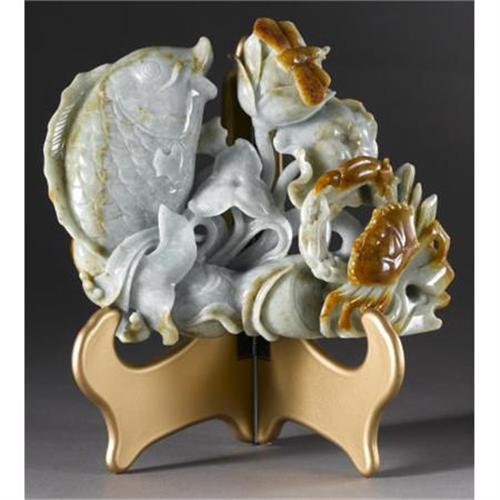 <B>CHINESE CARVED JADE/HARDSTONE GROUP</B></I><BR><BR>Chinese carved jade/hardstone openwork group, depicting a carp amid waves and surrounded by a crab, lotus, taels, and insect. Of green coloration with rust suffusions. With an easel stand<BR>5in. high x 6in. long<BR><BR> <B>Condition Report:</B> Normal signs of wear as appropriate with age; a few very minor losses.<BR><BR><b>Shipping:</b> Miscellaneous Collectibles, Larg (<a target="_blank" href="http://www.heritageauctions.com/common/shipping.php">view shipping information</a>)