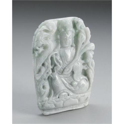 <B>CHINESE CARVED JADE/HARDSTONE PLAQUE</B></I><BR><BR>Chinese carved jade/hardstone openwork plaque depicting a guanyin holding a lotus and seated in a position of royal ease on a lotus base, flanked by a dragon and ruyi fungus. Of green coloration with bright green inclusions<BR>6-1/8in. high<BR><BR> <B>Condition Report:</B> A few chips at edges and to the tip of guanyin's nose.<BR><BR><b>Shipping:</b> Miscellaneous Collectibles, Larg (<a target="_blank" href="http://www.heritageauctions.com/common/shipping.php">view shipping information</a>)