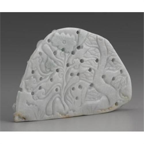 <B>CHINESE CARVED JADE/HARDSTONE PLAQUE</B></I><BR><BR>Chinese carved jade/hardstone reticulated plaque with two ducks in the water surrounded by ruyi fungus and flowers. Of pale green coloration<BR>6-3/8in. long<BR><BR> <B>Condition Report:</B> Normal signs of wear as appropriate with age.<BR><BR><b>Shipping:</b> Miscellaneous Collectibles, Larg (<a target="_blank" href="http://www.heritageauctions.com/common/shipping.php">view shipping information</a>)
