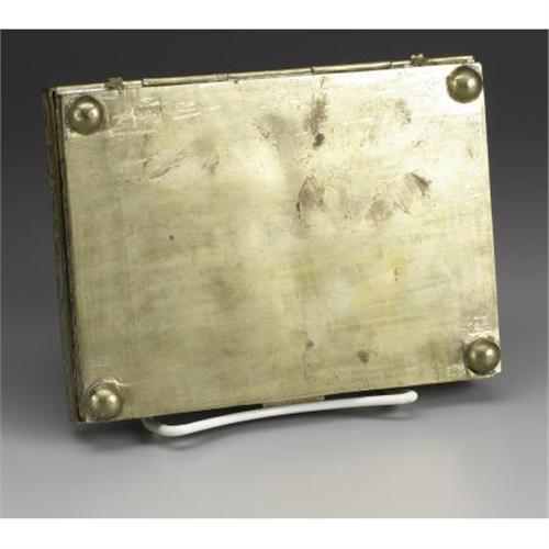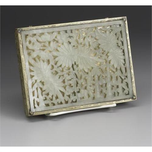 <B>CHINESE CARVED JADE/HARDSTONE PLAQUE</B></I><BR><BR>Chinese carved jade/hardstone reticulated plaque with bamboo and floral designs all over, set in a brass foliate cigarette box with two interior compartments. Of pale green/celadon coloration<BR>5-7/8in. high<BR><BR> <B>Condition Report:</B> Normal signs of wear as appropriate with age.<BR><BR><b>Shipping:</b> Miscellaneous Collectibles, Larg (<a target="_blank" href="http://www.heritageauctions.com/common/shipping.php">view shipping information</a>)