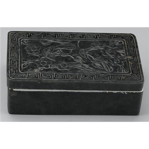 <B>CHINESE JADE/HARDSTONE BOX</B></I><BR><BR>Chinese carved jade/hardstone rectangular box, with design of foliage to cover. Of spinach green coloration<BR>5-3/4in. long x 3.5in. wide x 2in. high<BR><BR> <B>Condition Report:</B> Normal signs of wear as appropriate with age.<BR><BR><b>Shipping:</b> Hollowware/Pottery/Glass, Small (<a target="_blank" href="http://www.heritageauctions.com/common/shipping.php">view shipping information</a>)