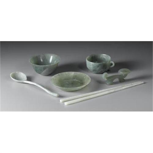 <B>SET OF CHINESE CARVED JADE/HARDSTONE SERVING PIECES</B></I><BR><BR>Set of Chinese carved jade/hardstone serving pieces, including a bowl, teacup and saucer, spoon, chopsticks, and a chopstick rest. All of pale green or green coloration<BR>Bowl: 3-3/4in. diameter and 2in. high<BR><BR> <B>Condition Report:</B> In overall very good condition, chip to rim of saucer.<BR><BR><b>Shipping:</b> Flatware (<a target="_blank" href="http://www.heritageauctions.com/common/shipping.php">view shipping information</a>)