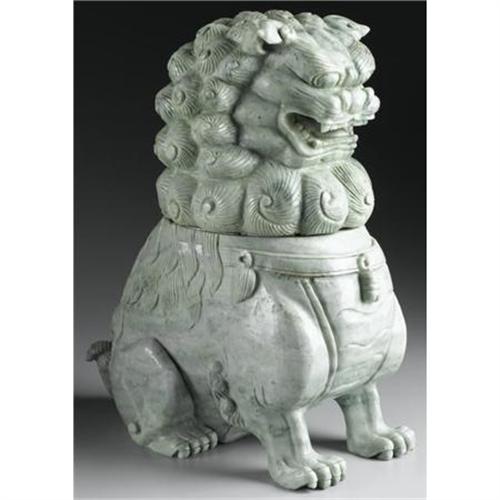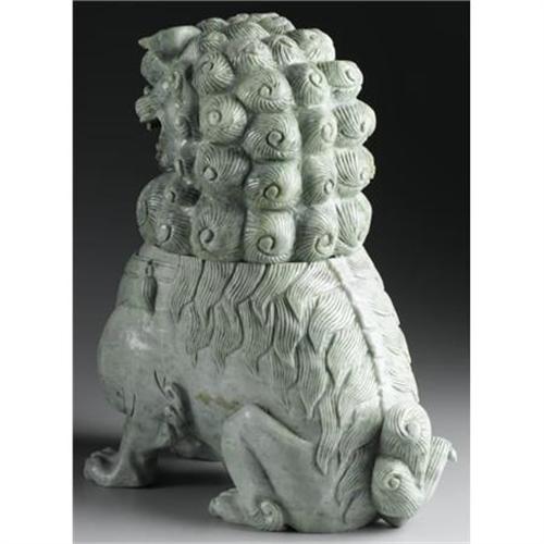 <B>CHINESE JADE/HARDSTONE VESSEL</B></I><BR><BR>Large Chinese carved jade/hardstone covered vessel, in the form of a seated shishi, wearing a collar and with a stylized mane. Of mottled green and grey coloration<BR>15in. high<BR><BR> <B>Condition Report:</B> Normal signs of wear as appropriate with age.<BR><BR><b>Shipping:</b> Miscellaneous Collectibles, Larg (<a target="_blank" href="http://www.heritageauctions.com/common/shipping.php">view shipping information</a>)