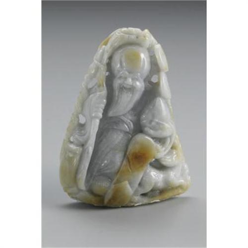<B>CHINESE CARVED JADE SHOULAO</B></I><BR><BR>Chinese carved jade/hardstone Shoulao with staff and peach, surrounded by bat, taels, stag and a stylized scepter. Signed to lower right and on reverse. Of grey coloration with rust suffusions<BR>5-1/2in. long<BR><BR> <B>Condition Report:</B> Normal signs of wear as appropriate with age.<BR><BR><b>Shipping:</b> Miscellaneous Collectibles, Larg (<a target="_blank" href="http://www.heritageauctions.com/common/shipping.php">view shipping information</a>)
