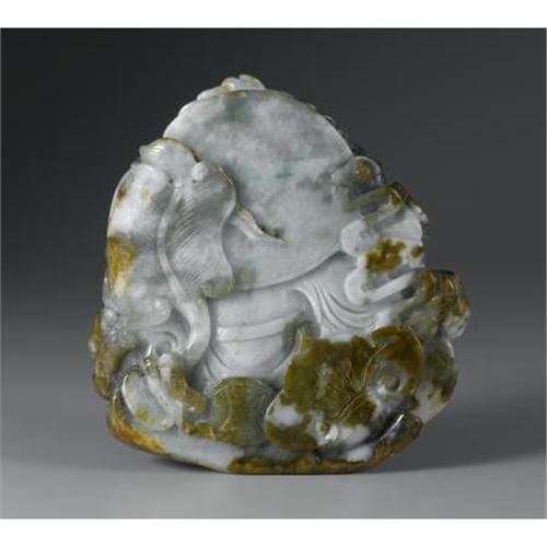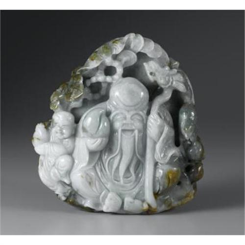 <B>CHINESE CARVED JADE/HARDSTONE SHULAO</B></I><BR><BR>Chinese carved jade/hardstone group depicting shulao, holding a dragon staff and peach, flanked by an attendant, surrounded by taels, fan, and bat. Of pale green coloration with rust and dark green suffusions<BR>5-1/4in. wide<BR><BR> <B>Condition Report:</B> Normal signs of wear as appropriate with age.<BR><BR><b>Shipping:</b> Miscellaneous Collectibles, Larg (<a target="_blank" href="http://www.heritageauctions.com/common/shipping.php">view shipping information</a>)
