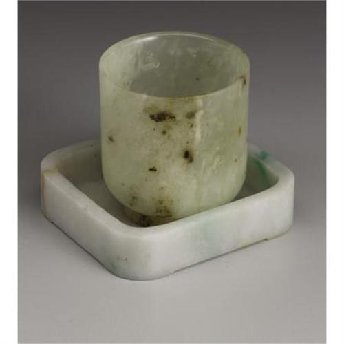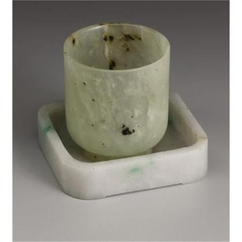<B>CHINESE CARVED JADE/HARDSTONE DISH AND CUP</B></I><BR><BR>Chinese carved jade/hardstone square dish with rounded corners of white coloration with icy green inclusions; together with a small wine cup. Yellow-green coloration with rust and black inclusions<BR>Dish: 2-3/4in. long Cup: 2-1/8in. high<BR><BR> <B>Condition Report:</B> Normal signs of wear as appropriate with age.<BR><BR><b>Shipping:</b> Miscellaneous Collectibles, Larg (<a target="_blank" href="http://www.heritageauctions.com/common/shipping.php">view shipping information</a>)