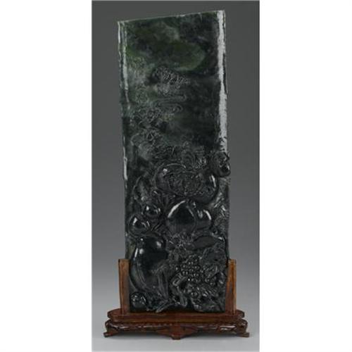 <B>CHINESE JADE/HARDSTONE TABLESCREEN</B></I><BR><BR>Chinese carved jade/hardstone tablescreen, in the form of a bamboo stalk, with designs of peaches, grapes, lotus, and foliage to one side, and bi and chilongs to the other. Of dark green coloration. On a wood stand<BR>20in. high<BR><BR> <B>Condition Report:</B> Some cracks.<BR><BR><b>Shipping:</b> Miscellaneous Collectibles, Larg (<a target="_blank" href="http://www.heritageauctions.com/common/shipping.php">view shipping information</a>)
