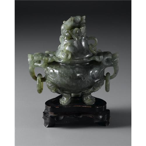 <B>CHINESE CARVED JADE/HARDSTONE TRIPOD KORO</B></I><BR><BR>Chinese carved jade/hardstone tripod koro and cover, with qilin finial above three loose ring handles on cover, surmounting qilin head double handles with loose rings. Of green coloration. On a wood stand<BR>5.5in. high x 6in. wide<BR><BR> <BR><BR><b>Shipping:</b> Miscellaneous Collectibles, Larg (<a target="_blank" href="http://www.heritageauctions.com/common/shipping.php">view shipping information</a>)