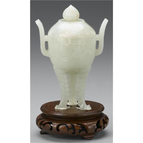 <B>CHINESE JADE/HARDSTONE TRIPOD KORO</B></I><BR><BR>Chinese carved jade/hardstone tripod koro and cover, with double handles and foliate designs. Of celadon coloration. On a wood stand<BR>4-3/4in. high<BR><BR> <B>Condition Report:</B> Normal signs of wear as appropriate with age; minor chips to edge of base legs.<BR><BR><b>Shipping:</b> Hollowware/Pottery/Glass, Small (<a target="_blank" href="http://www.heritageauctions.com/common/shipping.php">view shipping information</a>)