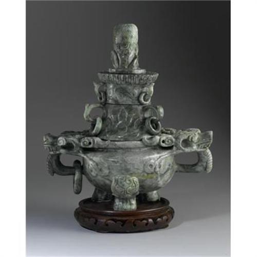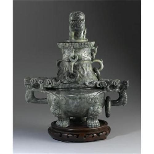 <B>CHINESE JADE/HARDSTONE TRIPOD KORO</B></I><BR><BR>Chinese carved jade/hardstone tripod koro and cover, with qilin mask double loose ring handles to body of vessel, and seated dog finial surmounting six loose ring handles. Of mottled green and white coloration<BR>12-1/2in. high<BR><BR> <B>Condition Report:</B> Normal signs of wear as appropriate with age; one loose ring broken in two pieces.<BR><BR><b>Shipping:</b> Miscellaneous Collectibles, Smal (<a target="_blank" href="http://www.heritageauctions.com/common/shipping.php">view shipping information</a>)