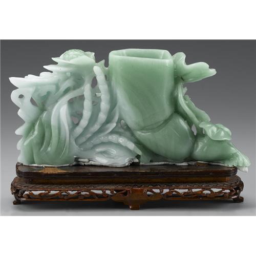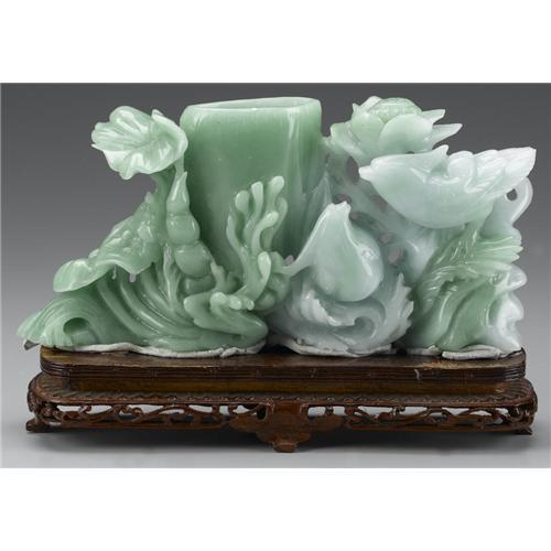 <B>CHINESE JADE/HARDSTONE VESSEL</B></I><BR><BR>Chinese carved jade/hardstone vessel, surrounded by birds amid lotus, foliage, and blossoming flowers. Of mottled pale green and green coloration. On a wood stand<BR>4.5in. high x 9in. long<BR><BR> <B>Condition Report:</B> Normal signs of wear as appropriate with age.<BR><BR><b>Shipping:</b> Hollowware/Pottery/Glass, Small (<a target="_blank" href="http://www.heritageauctions.com/common/shipping.php">view shipping information</a>)