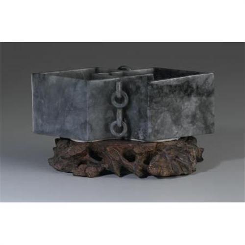 <B>CHINESE JADE/HARDSTONE VESSEL</B></I><BR><BR>Chinese carved jade/hardstone vessel, of geometric form, with three compartments, and two sets of double loose ring handles to each side. Of mottled green and dark gray coloration. On a wooden stand with carved pines<BR>2in. high x 6-1/4in. long<BR><BR> <B>Condition Report:</B> Normal signs of wear as appropriate with age.<BR><BR><b>Shipping:</b> Miscellaneous Collectibles, Smal (<a target="_blank" href="http://www.heritageauctions.com/common/shipping.php">view shipping information</a>)