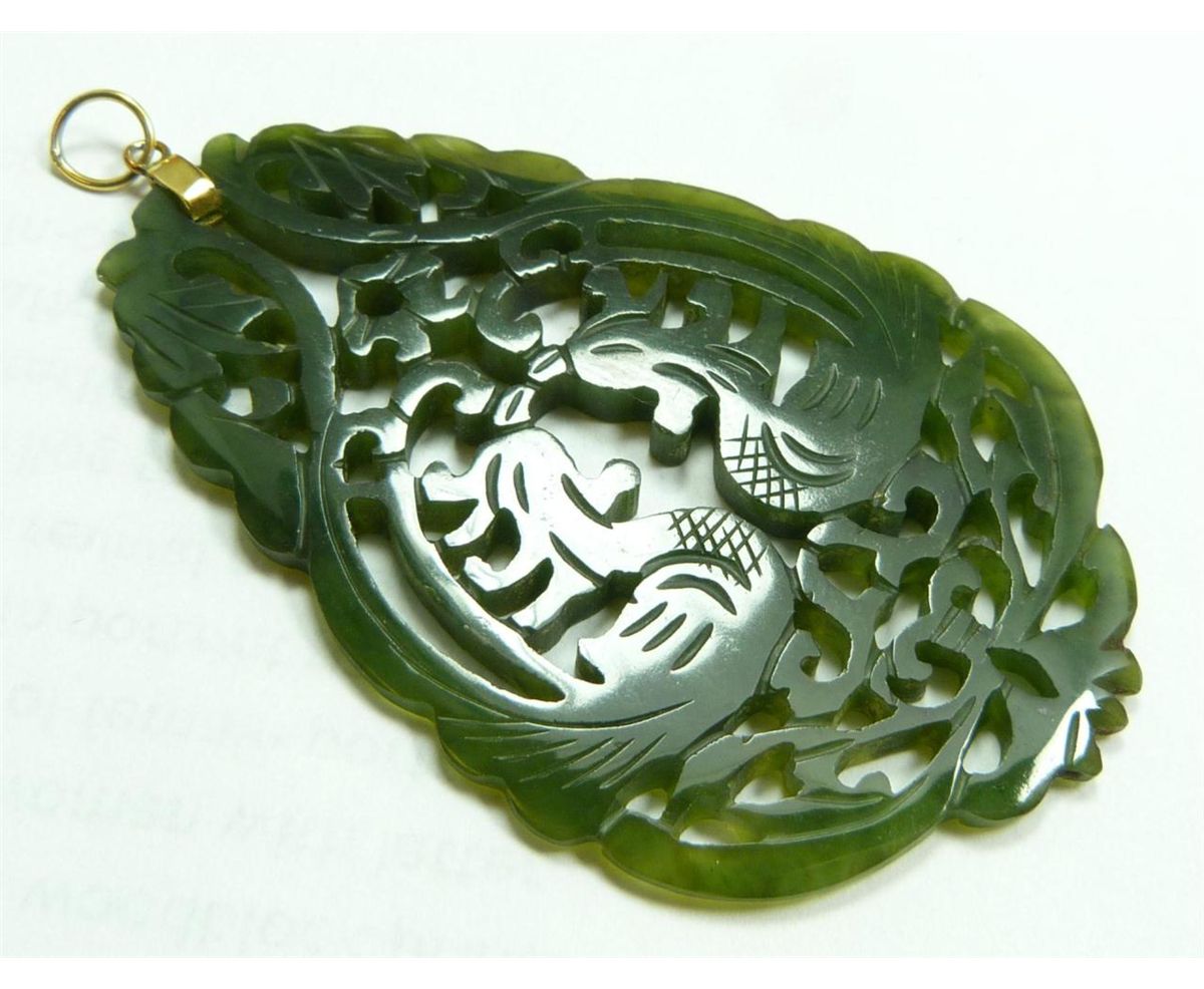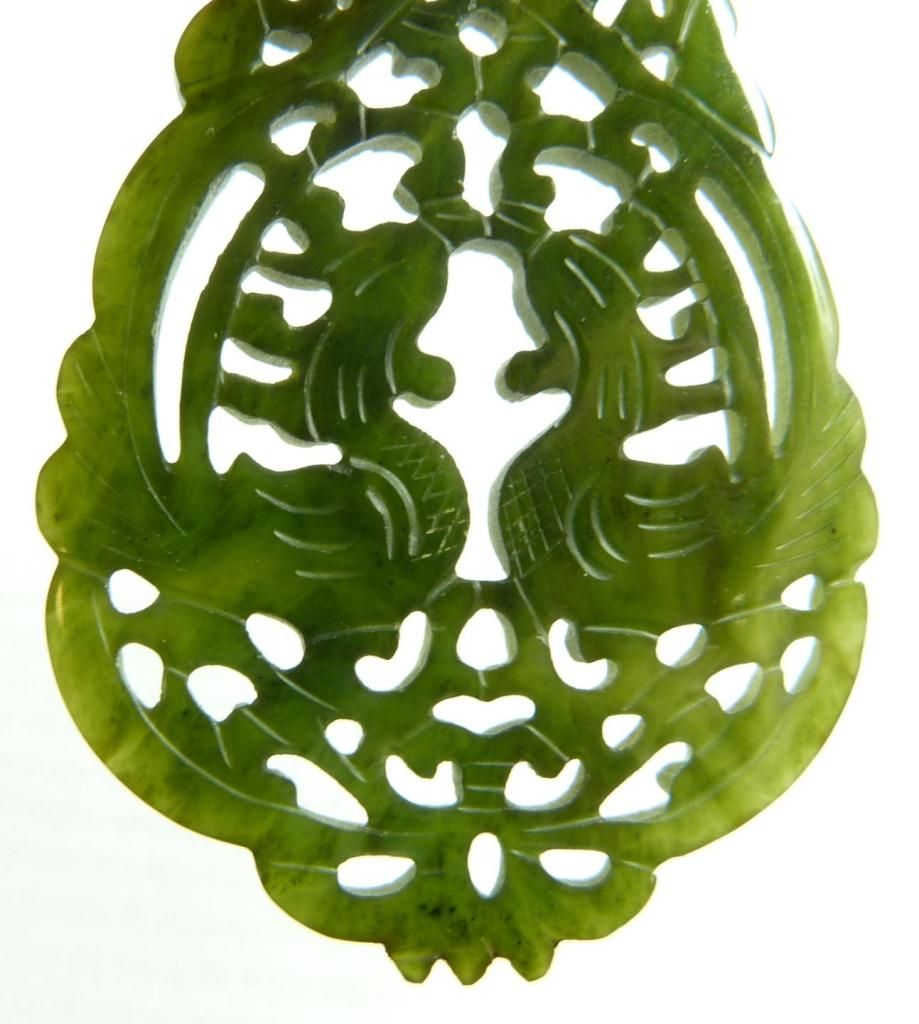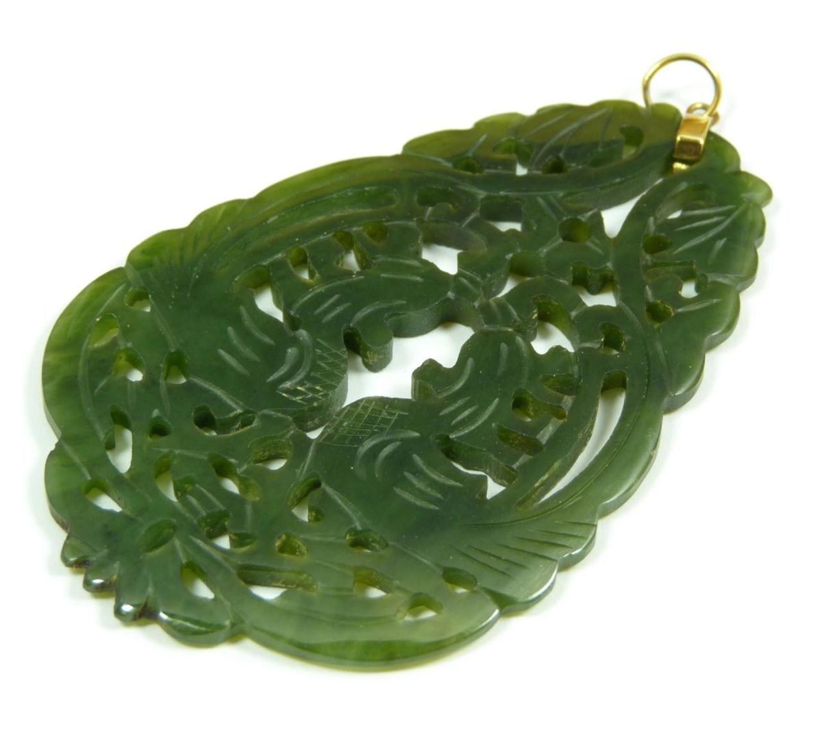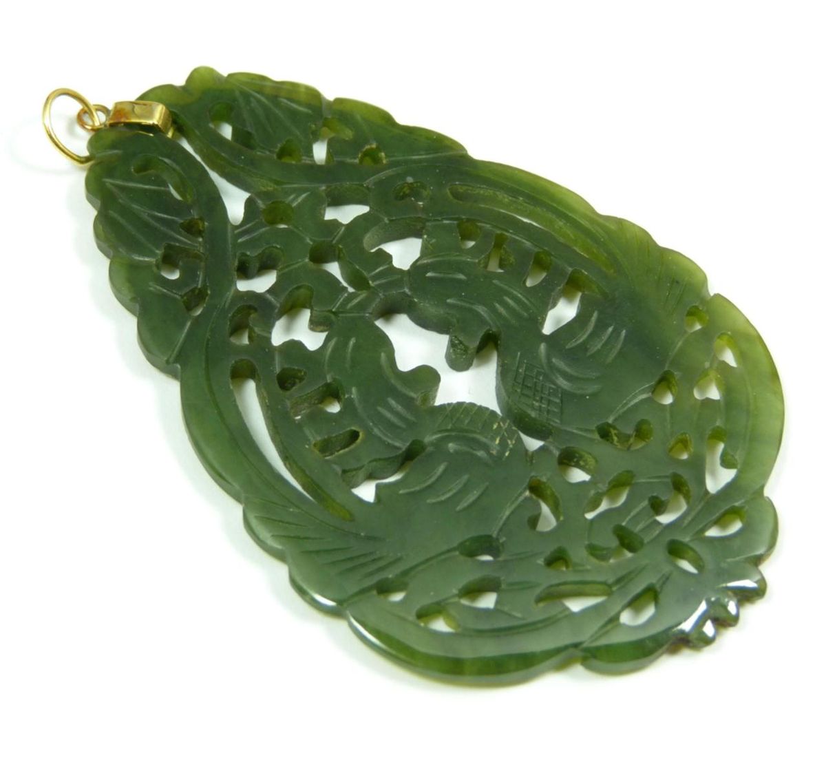 A Chinese fully reticulated carved jade pendant having a gold tone bail. Depicts dual phoenix birds with leaves and vines. Translucent spinach jade stone. Measures 2 3/4" length x 1 3/4" width (6.9cm x 4.4cm). Total weight of 13.3 grams.