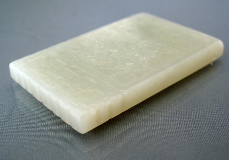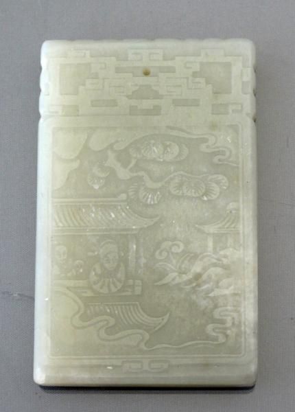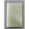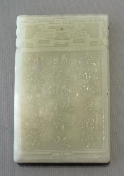 - rectangular plaque decorated with figural scene on front and seal style verses on reverse. The stone is of celadon colour.