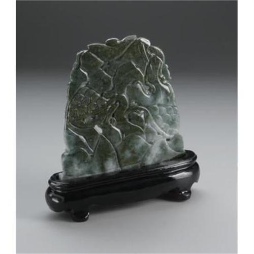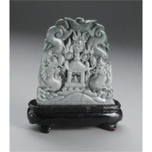 <B>CHINESE CARVED JADE PLAQUE</B></I><BR><BR>Chinese carved jade/hardstone plaque, depicting two writhing dragons flanking a flaming pearl and pagoda, all surmounted by a tael. Of green coloration. On a wood base<BR>6-1/4in. high<BR><BR> <B>Condition Report:</B> Normal signs of wear as appropriate with age.<BR><BR><b>Shipping:</b> Miscellaneous Collectibles, Larg (<a target="_blank" href="http://www.heritageauctions.com/common/shipping.php">view shipping information</a>)