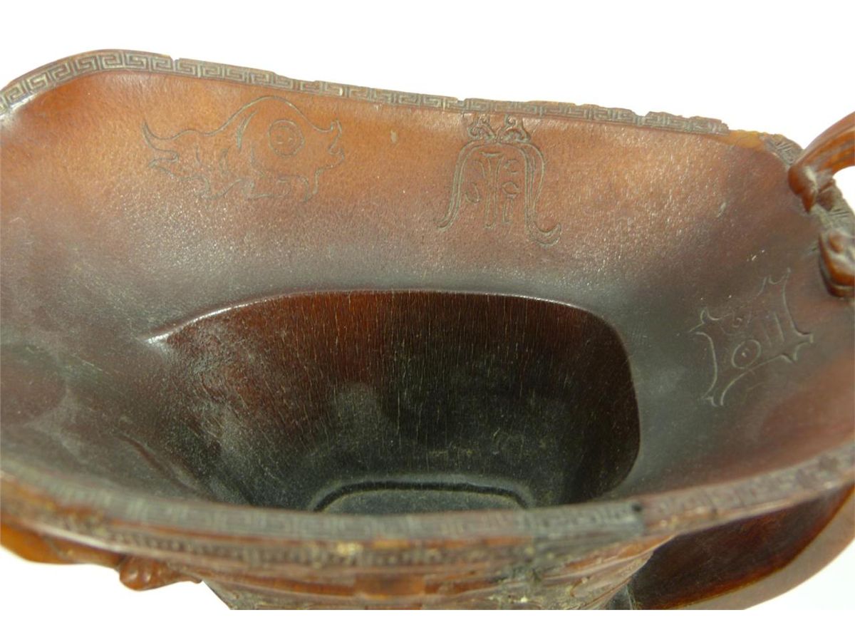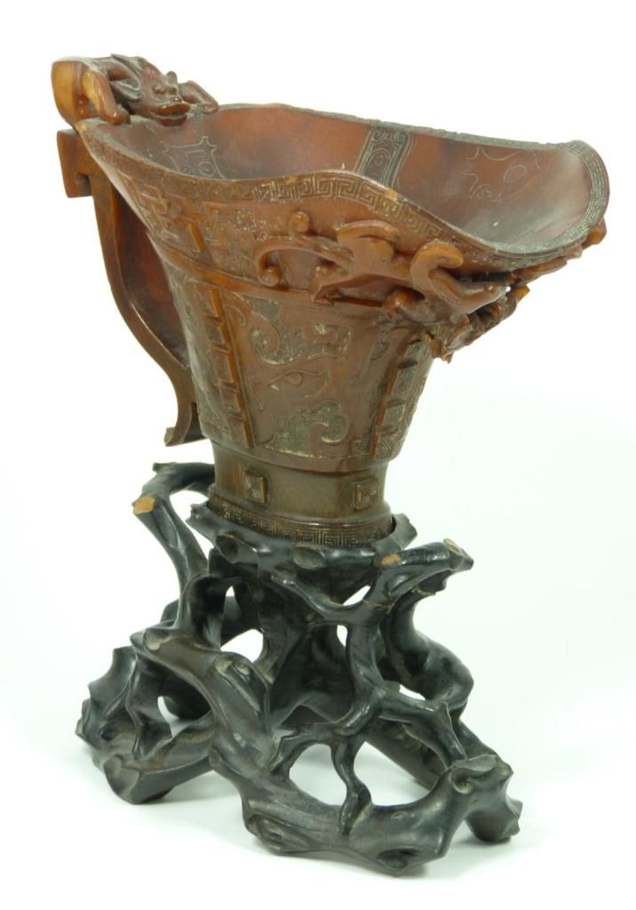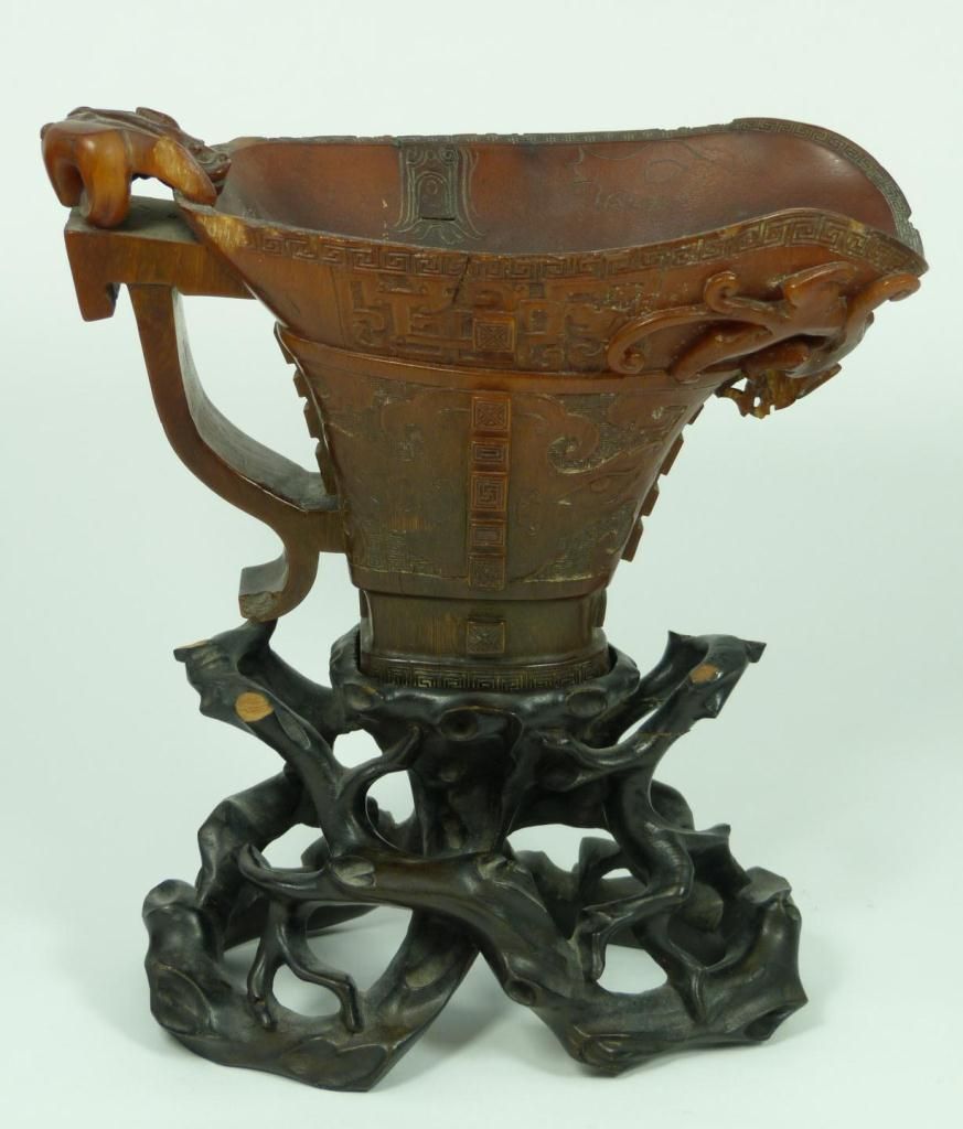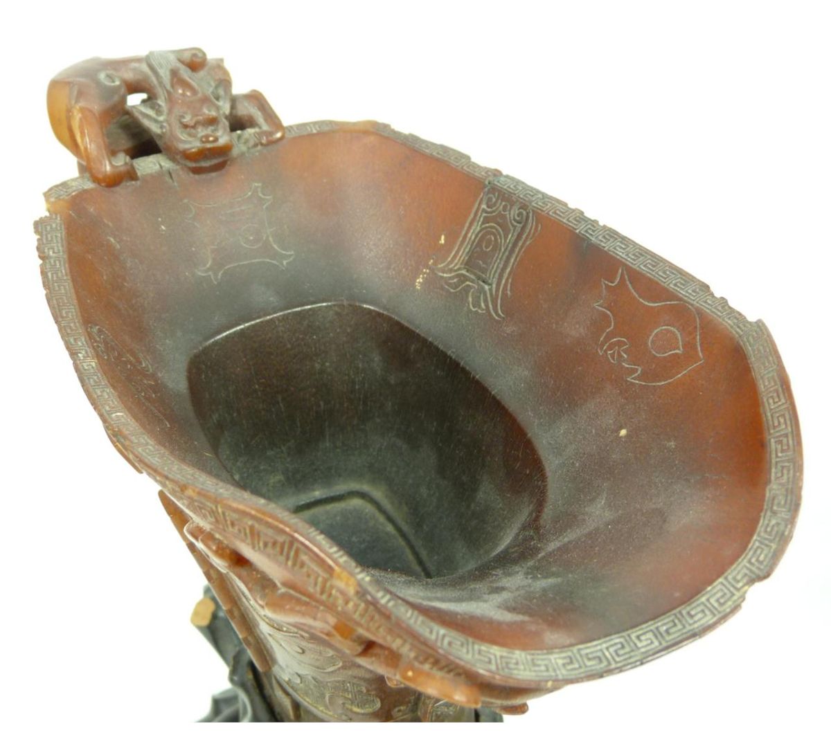 An antique Chinese carved rhinoceros horn dragon libation cup. Has figural Chih lung dragons to top of handle and front of spout. Relief foo mask and archaic design with Etruscan pattern borders. Includes fitted wooden branch form base. Qind dynasty period. Measures 4 1/2" height x 7 1/8" length x 3 3/4" width + 3 1/8" base height (11.4cm x 18cm x 3.1cm). Total horn weight of 334 grams.