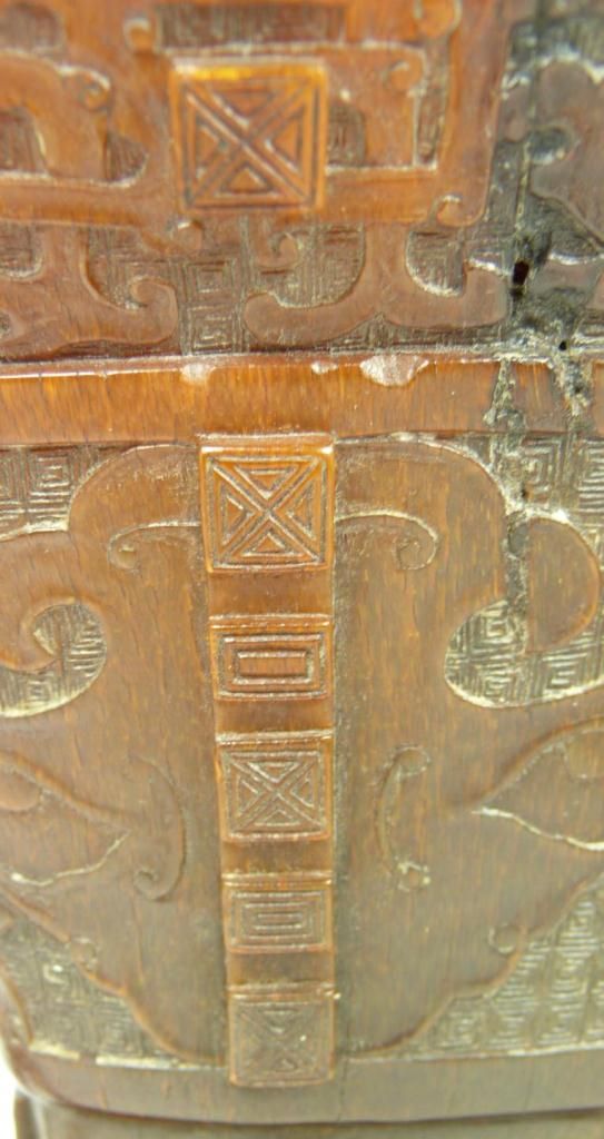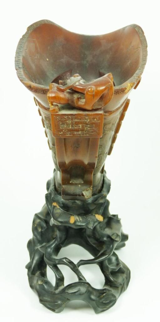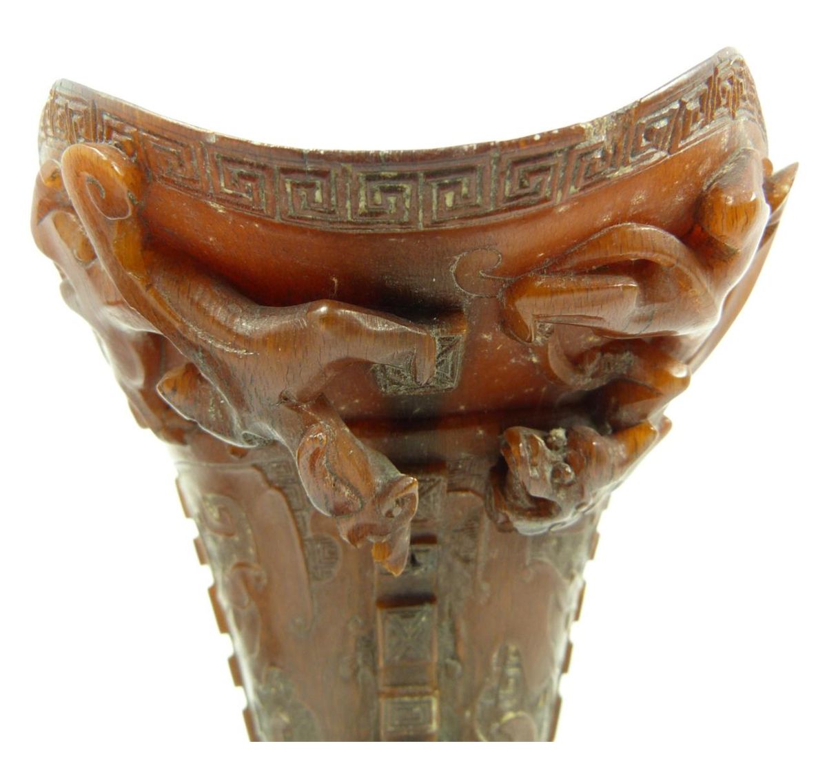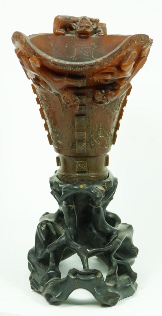 An antique Chinese carved rhinoceros horn dragon libation cup. Has figural Chih lung dragons to top of handle and front of spout. Relief foo mask and archaic design with Etruscan pattern borders. Includes fitted wooden branch form base. Qind dynasty period. Measures 4 1/2" height x 7 1/8" length x 3 3/4" width + 3 1/8" base height (11.4cm x 18cm x 3.1cm). Total horn weight of 334 grams.