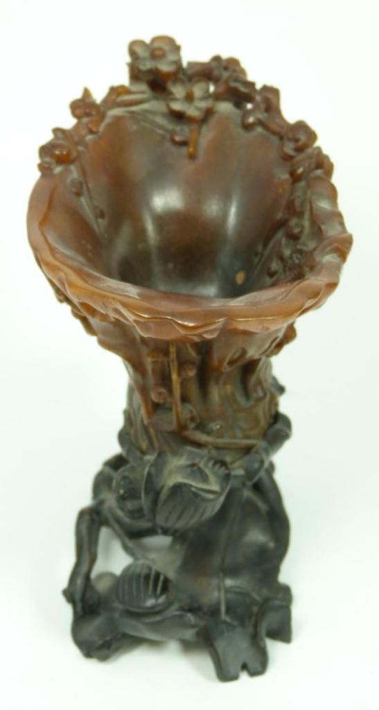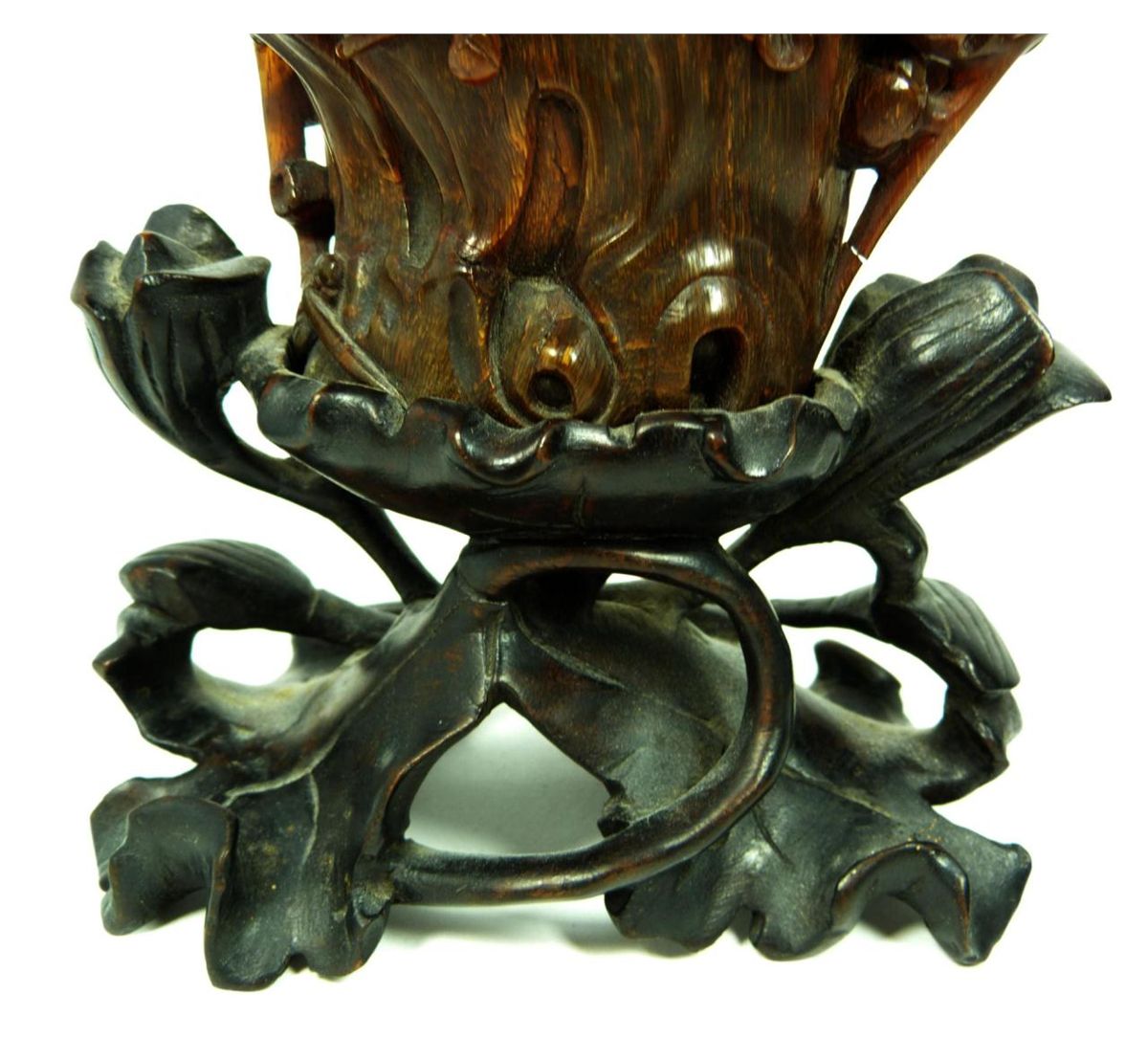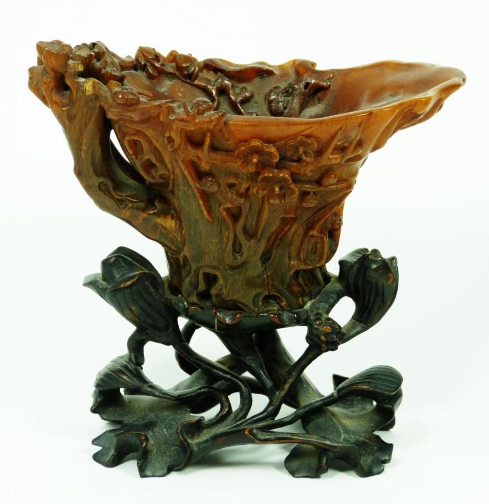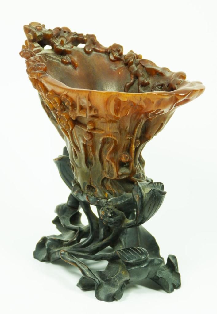 A finely carved antique Chinese rhinoceros horn floral libation cup having a figural stump and floral vine design throughout. Figural branch form handle. Includes fitted wooden flora form and lily pad base. Qing dynasty period. Horn measures 4" height x 6" length x 3 1/2" depth + 2 1/8" base height (10.1cm x 15.2cm x 8.9cm + 5.4cm). Total horn weight of 249 grams.