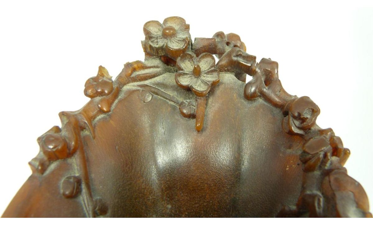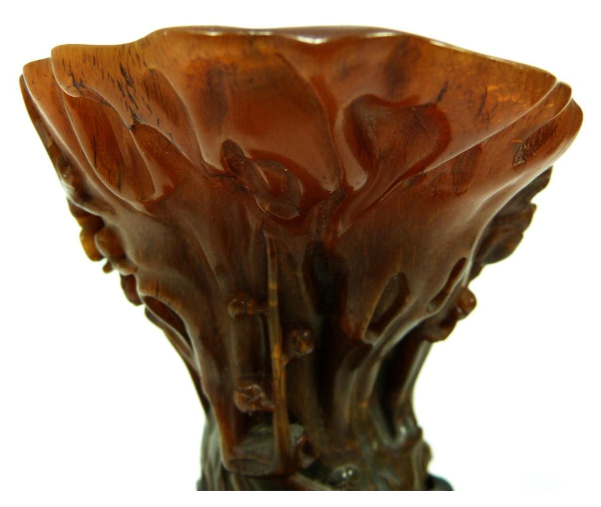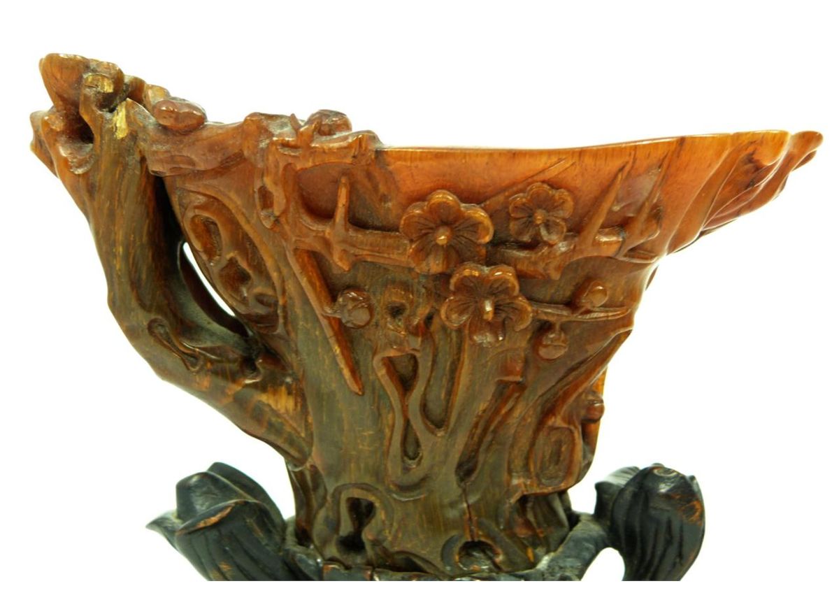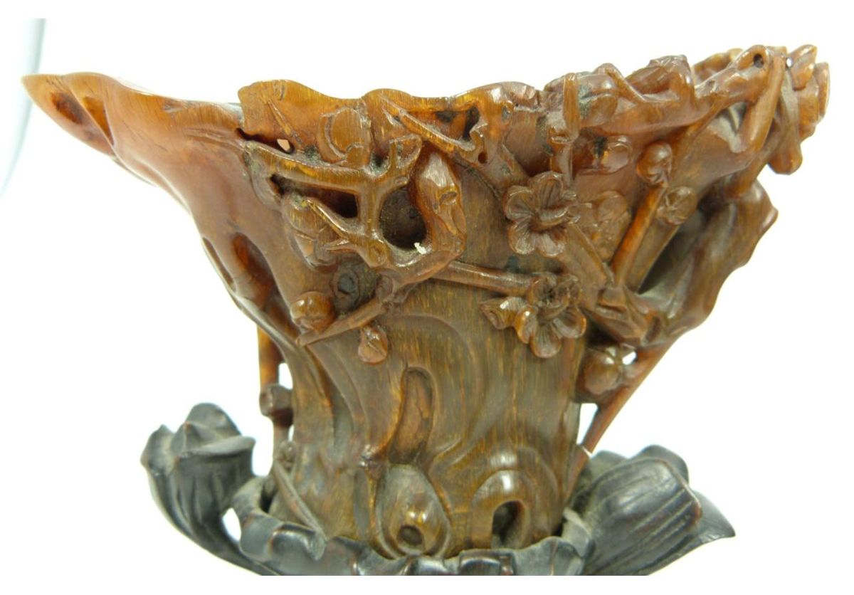 A finely carved antique Chinese rhinoceros horn floral libation cup having a figural stump and floral vine design throughout. Figural branch form handle. Includes fitted wooden flora form and lily pad base. Qing dynasty period. Horn measures 4" height x 6" length x 3 1/2" depth + 2 1/8" base height (10.1cm x 15.2cm x 8.9cm + 5.4cm). Total horn weight of 249 grams.