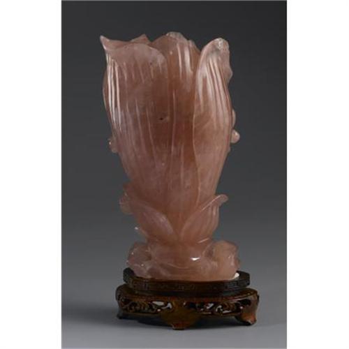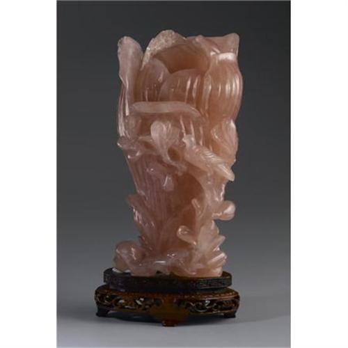 <B>CHINESE ROSE QUARTZ VESSEL</B></I><BR><BR>Chinese carved rose quartz vessel, in the form of a blossom, surrounded by a bird perched on a vine. On a wood stand<BR>7-1/2in. high x 4in. wide<BR><BR> <B>Condition Report:</B> Large loss to top.<BR><BR><b>Shipping:</b> Miscellaneous Collectibles, Smal (<a target="_blank" href="http://www.heritageauctions.com/common/shipping.php">view shipping information</a>)