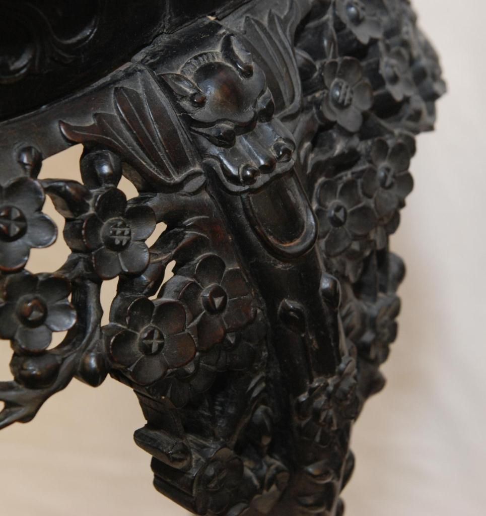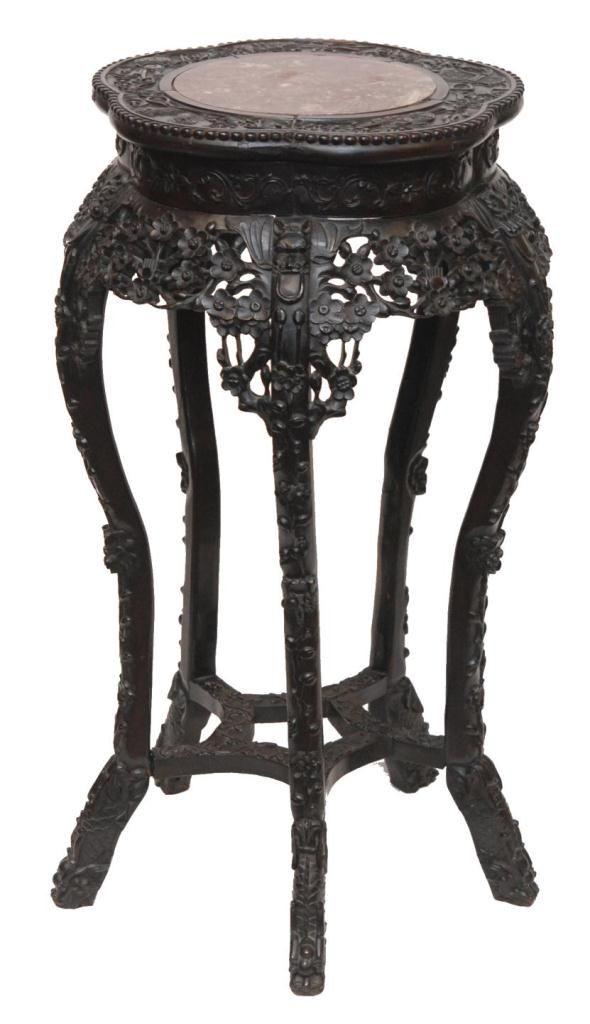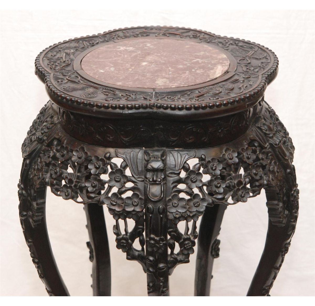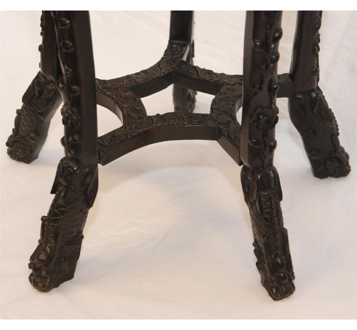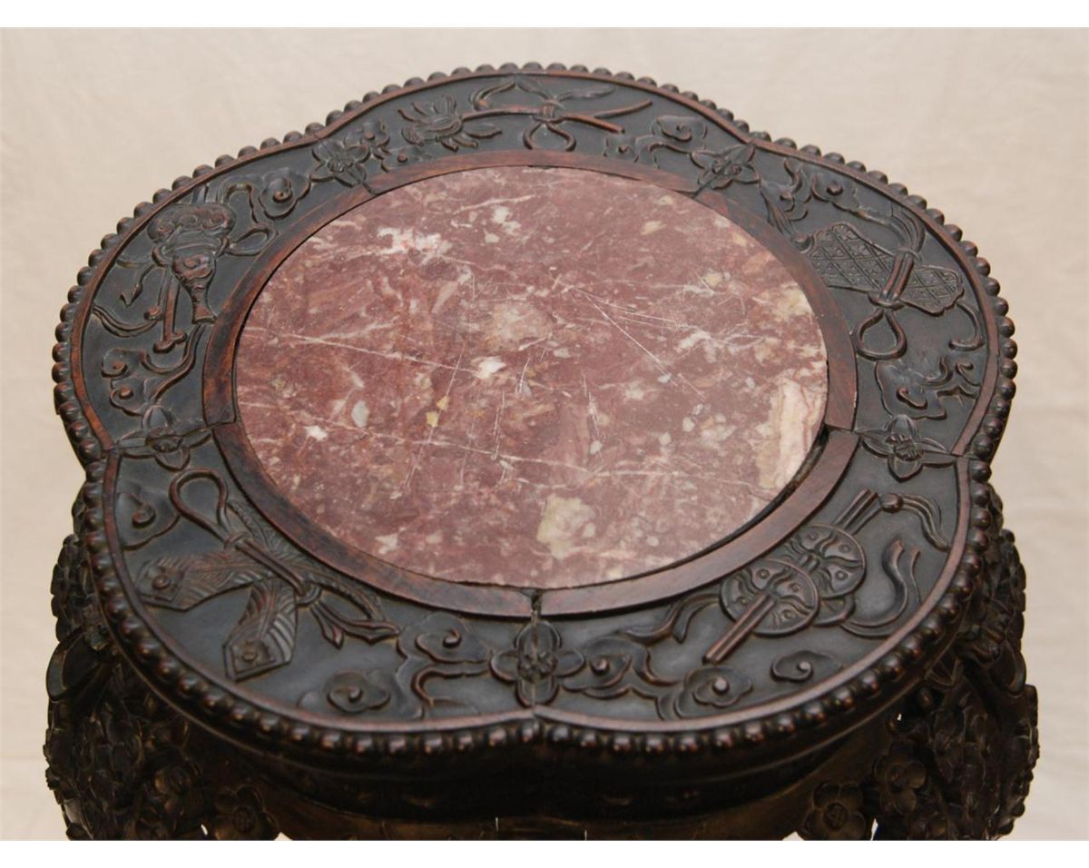 Chinese hand carved teakwood table with floral shaped fitted marble inlay top. Rim of plateau has relief floral design with stork and beaded edge. Fully reticulated design to sides depicting flowers. Has five legs with raised floral designs throughout completed with foo masks at top. Each leg supported by a crescent bar creating a five point star stretcher. Measures 33" height x 19" diameter (83.8cm x 48.2cm).