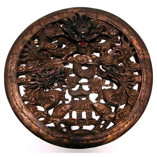 A CHINESE CARVED GILT WOOD CIRCULAR DRAGON WINDOW<p>A beautiful reticulated round partially-gilt wood window, carved throughout in full-relief with a dragon staring straight forward and two other dragons flanking and facing it, all three of which are shown flying through clouds. Dragons are symbolic of divine force and great strength and wisdom. Below the dragons are two fish amid waves on either side of a pagoda or temple. The fish in Chinese art has several meanings. It is the emblem of wealth and abundance. Due to its reproductive powers, it is a symbol of regeneration, and since it is thought to be happy in its own realm, it has come to be symbolic of harmony and connubial bliss. The fish also signifies freedom from all restraints, because in the water a fish moves easily in any direction. In the Buddha-state the fully-emancipated being knows no restraints or obstruction. <P>This piece can actually be used as a window, as it was in China, or as a spectacular wall piece. The patina is a matte reddish-brown pigment with partial gilding and some polychrome (such as the dragon's tongue). It is 20" in diameter, and about 3.5" deep at its thickest point. It is in excellent condition considering its age. It is unusual in the number of dragons and the quality of the carving. More photos are available.