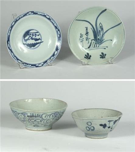 CERAMICS: Lot four Chinese ceramic items having cobalt slip decoration over a beige ground, late 18th and 19th c. examples. Note chips.