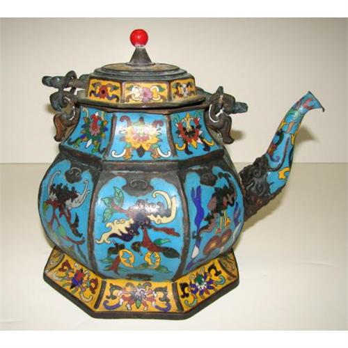 CHINESE CHAMPLEVE TEA KETTLE. Multi-color enamel decoration on yellow blue base colors. Finial replaced. Some minor dents to bronze. Height to top of finial – 8.75”. Finial replaced. 2nd quarter 20th century.