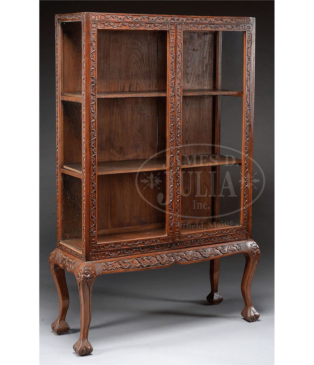 19th century, probably England. The rectangular cabinet fitted with glass panels on the sides, the front with a pair of cabinet glass panel doors, the frames carved in deep relief with scrolling floral garlands. Mounted on a conforming base with carved apron on short molded cabriole legs terminating in scrolled and carved stylized feet. SIZE: 65" h x 42" w x 16" d. CONDITION: Cabinet retains original polished surfaces. Molded cornice absent at time of cataloging. The cabinet fitted to the carved base. 9-90147