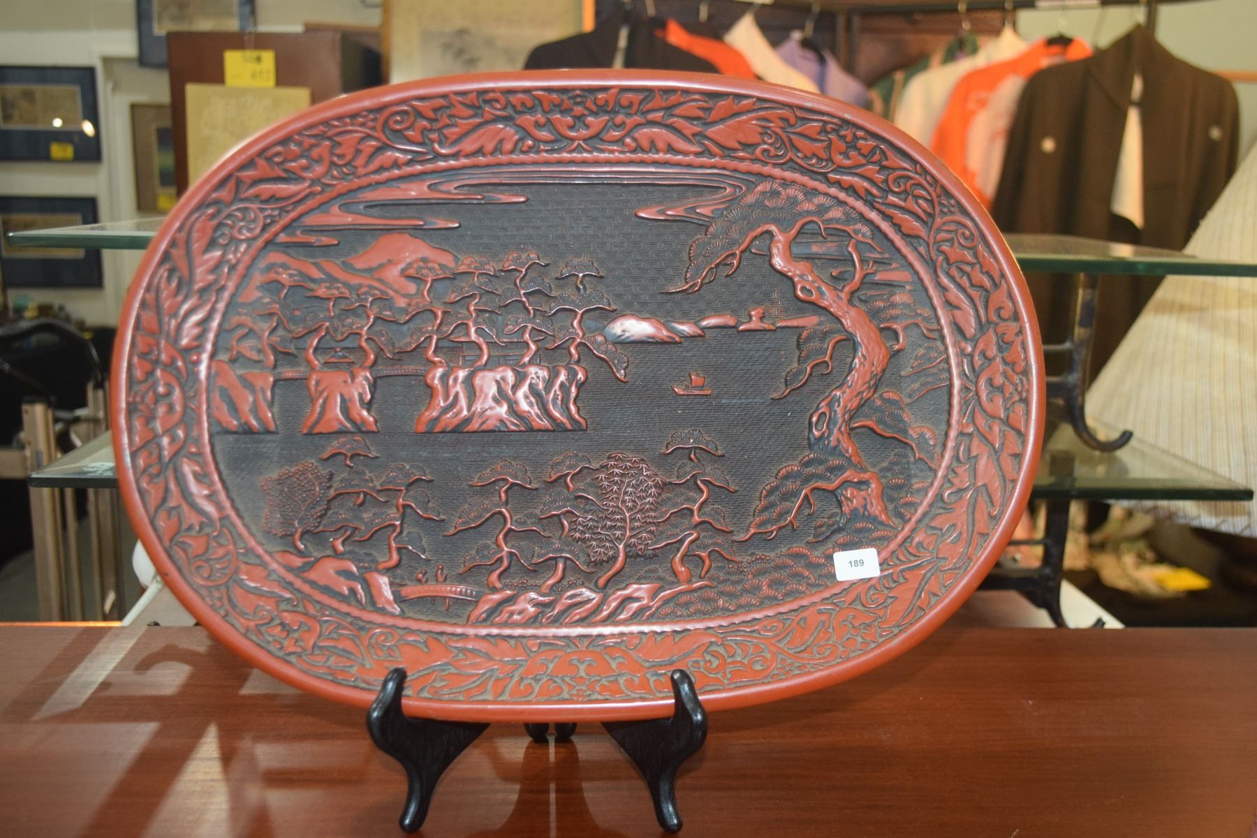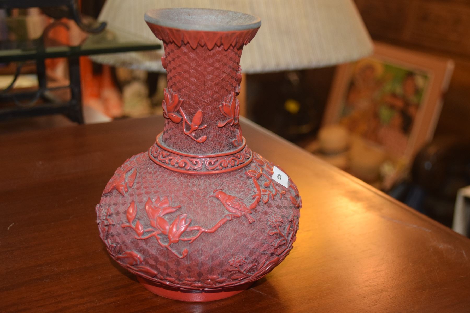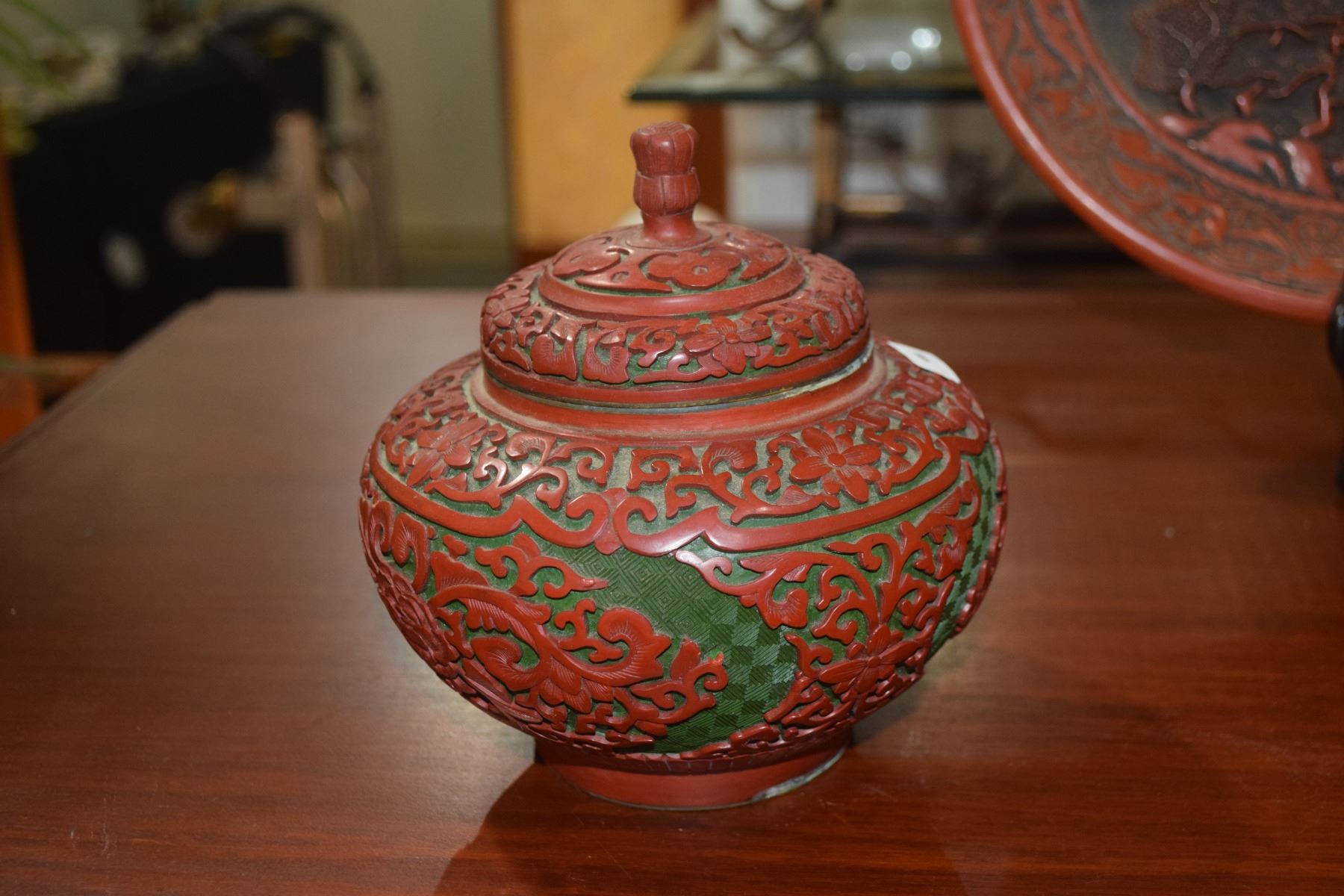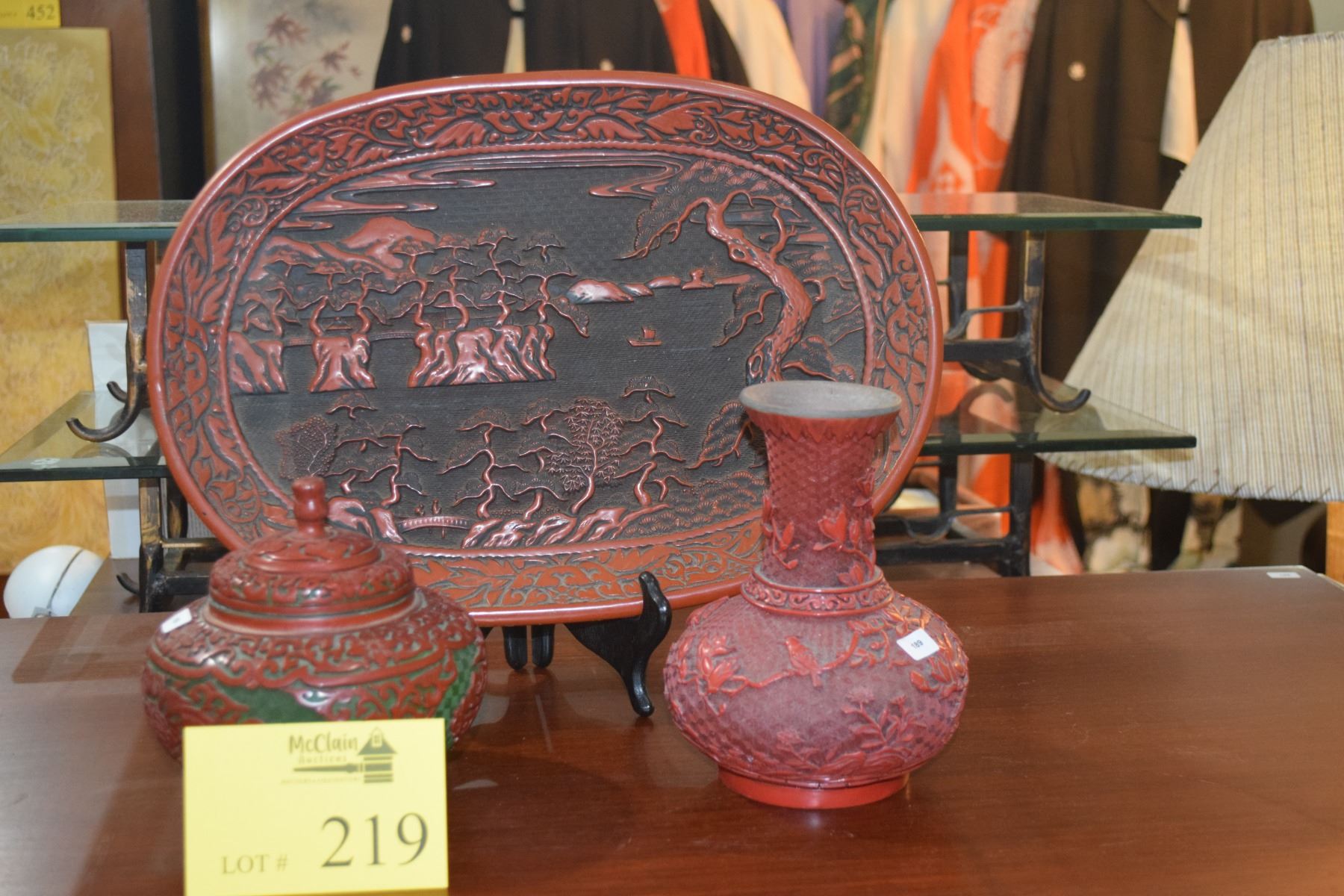 CHINESE CINNABAR LIDDED JAR, VASE & TRAY (3 PCS) (DOES NOT INCLUDE STAND)