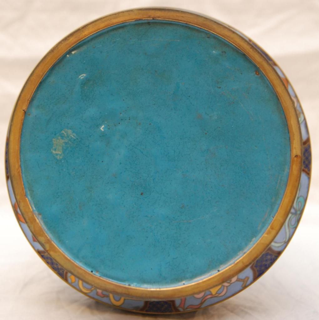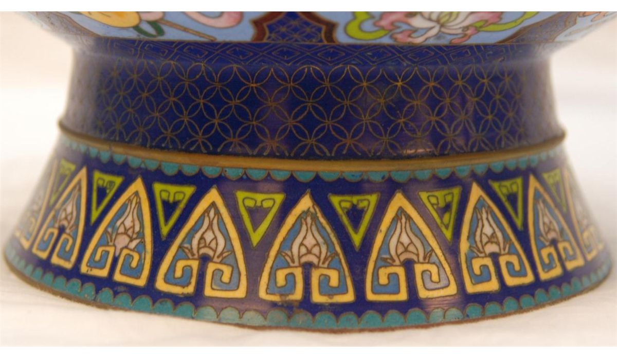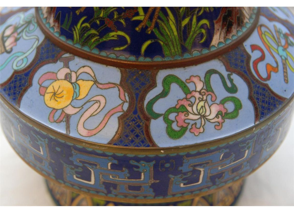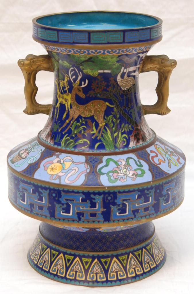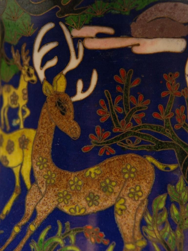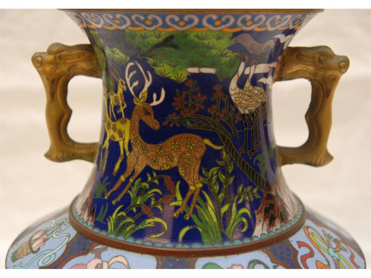 Chinese cloisonne vase depicting deer with cranes. Trees, flowers and rock formations can also be seen. Archaic Chih lung dragon pattern to body band. 19th/20th century. Measures 12 3/8" height x 9 1/2" diameter (31.4cm x 24.1cm). Total weight of 3.82 kilograms.
