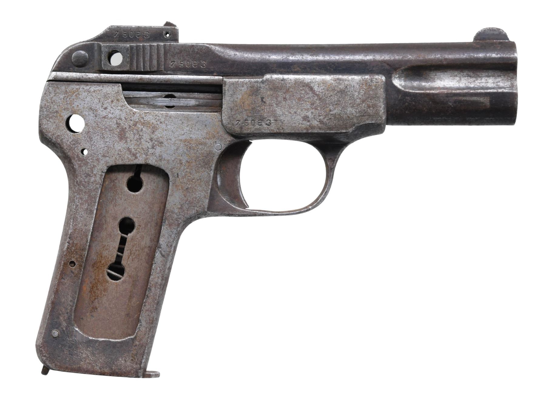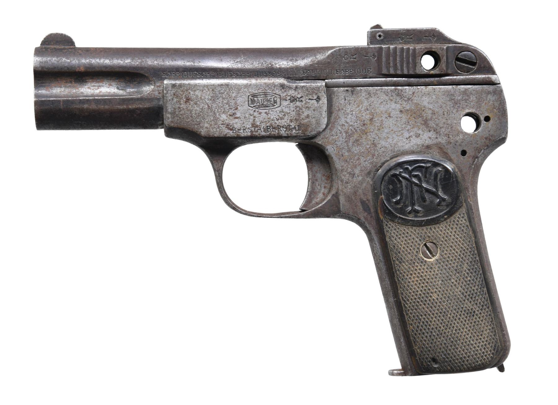 Cal. 32. S# 25083. Bbl. 3 7/8". Copy of an FN Model 1900 semi-automatic pistol mfg. in China. Left side of the slide is marked with faux Chinese FN markings, with the left side of the frame exhibit a faux Chinese Mauser banner logo above "BERSTALBERSTAL". Left side of the receiver side base, slide, and frame, exhibit faux Chinese Belgian style commercial proofs. Metal components exhibit a blue finish. Frame is mounted with 1 faux FN checkered brown horn grip. Matching numbers are present on the frame, slide, and rear sight base. MAGS: 1 7-rd. CONDITION: metal components retain traces of their original blue finish, with the balance exhibiting a gray patina, with scattered areas of oxidation and pitting present overall. Dark pitted bore, retaining fair rifling throughout. Left grip panel exhibits smoothing and some scattered superficial marks from handling and storage. Bottom right corner of grip is missing a small section of material. (25-589/MLW). CURIO. $50-100.