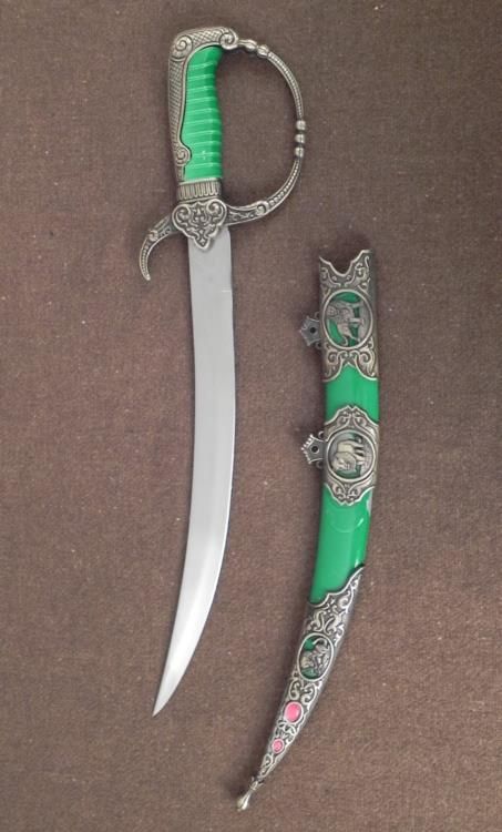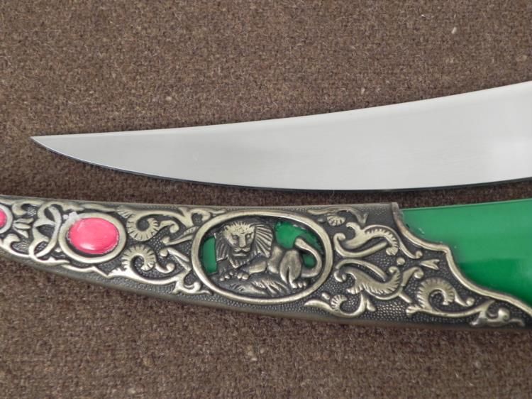 CHINESE CURVED SHORT SWORD-17" LONG-LION PANELS-NICE STEEL BLADE GREAT LOOKING ARTISTIC SHORT SWORD-CHINESE MADE PROBABLY FROM THE 60'S OR 70'S VINTAGE-BEAUTIGUL DETAIL-3 LION SCENES ON EACH SIDE OF SCABBARD-FAUX JEWELS TOWARD BOTTOM OF SCABBARD-STAINLESS STEEL