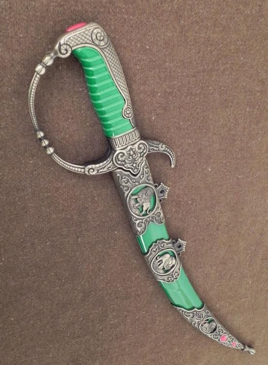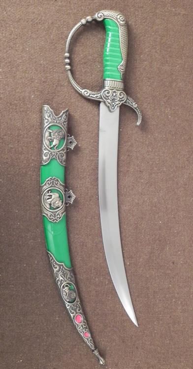 CHINESE CURVED SHORT SWORD-17" LONG-LION PANELS-NICE STEEL BLADE GREAT LOOKING ARTISTIC SHORT SWORD-CHINESE MADE PROBABLY FROM THE 60'S OR 70'S VINTAGE-BEAUTIGUL DETAIL-3 LION SCENES ON EACH SIDE OF SCABBARD-FAUX JEWELS TOWARD BOTTOM OF SCABBARD-STAINLESS STEEL
