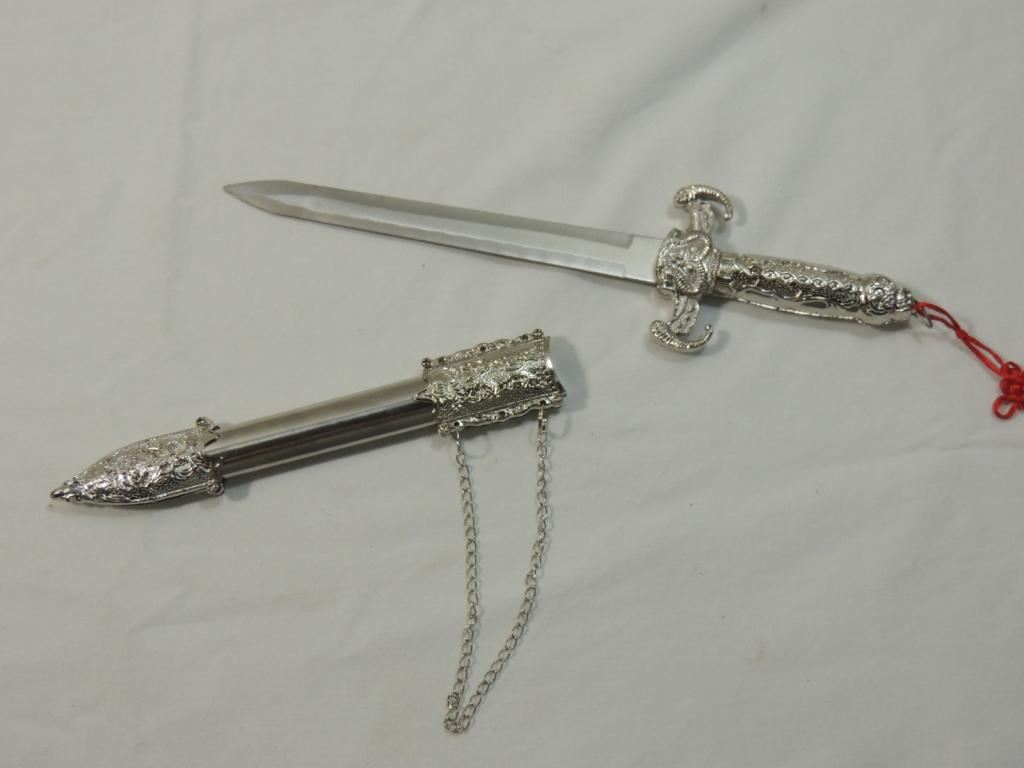DECORATIVE DAGGER, STYLIZED DAGGER, SHEATH INCLUDED AS SHOWN SEE PHOTO FOR MORE DETAILS.