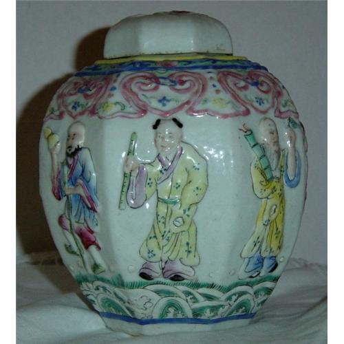 This is a much copied original CHINESE porcelain repousse GINGER JAR. The polychromed famille rose enamels are well executed with fine detail to the eight immortals which appear on the octagonal jar and lid. This is a stellar piece. Marked as early Qing Dynasty, but dates to late 19th century.