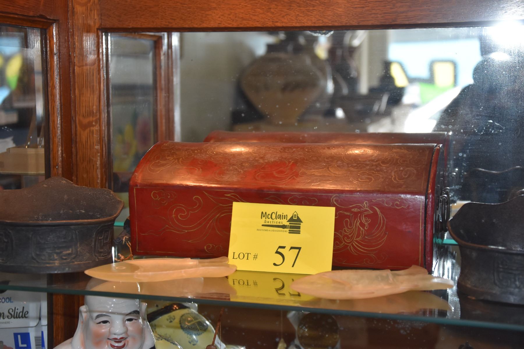 CHINESE DOMED RED LACQUER DOCUMENT BOX, PEN FORM IRONS W/WOOD HANDLES & FISH SHAPED STONE TRAYS (5 PCS)