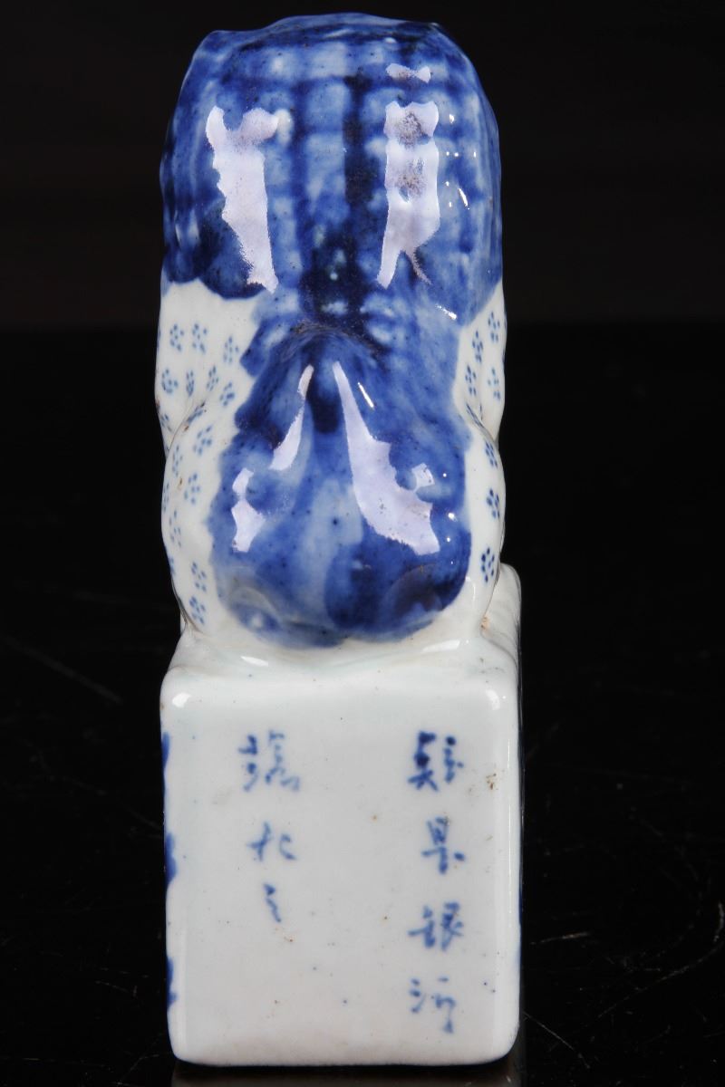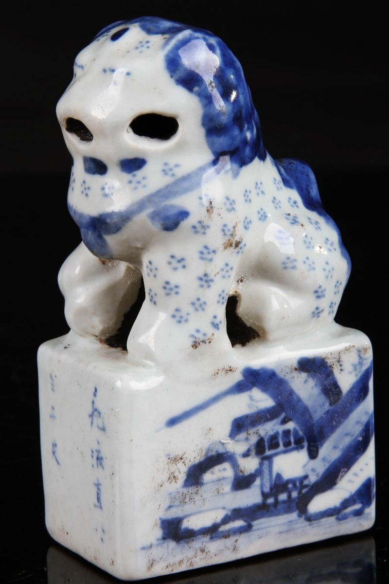 [CHINESE] EARLY 20TH CENTURY BLUE AND WITH PORCELAIN SEAL ORNAMENT CARVED WITH LION AND PAINTED WITH LANDSCAPE L:2.5" W:15" H:4.1"精美二十世纪早期青花狮镇山水楼阁印章摆件