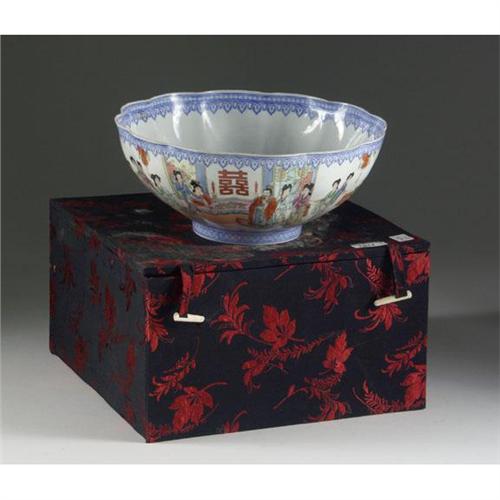 EGGSHELL PORCELAIN: A large famille rose eggshell porcelain bowl, figural decoration, 18 beauties and a scholar, Ch'ien Leung mark, 4'' x 10'', original presentation box (mildew damage noted to lid, as seen), 20th century.