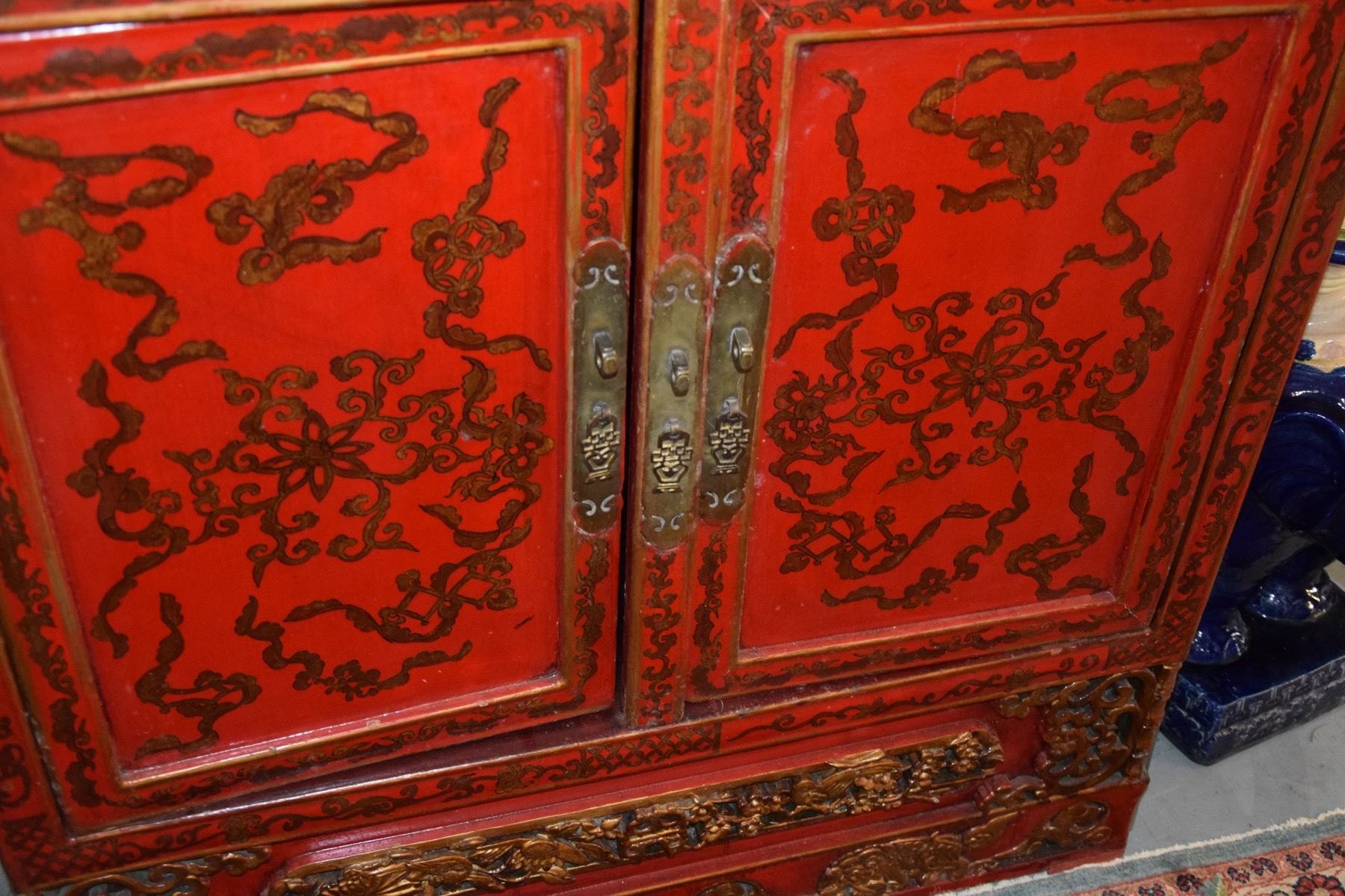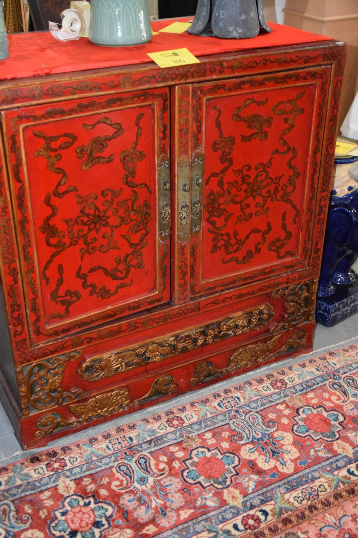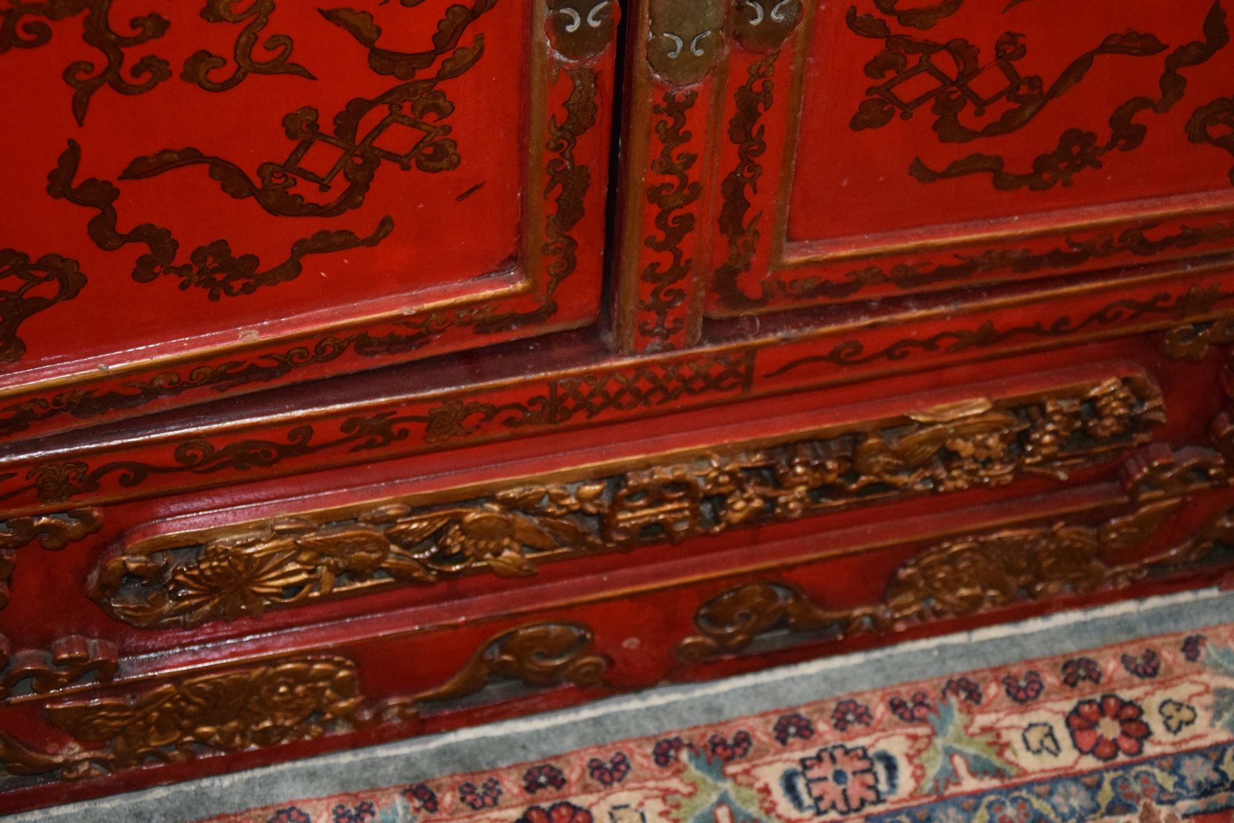CHINESE ELABORATELY DECORATED RED & GOLD CABINET (37.5" W X 22 1/4" D X 38 1/2" H)