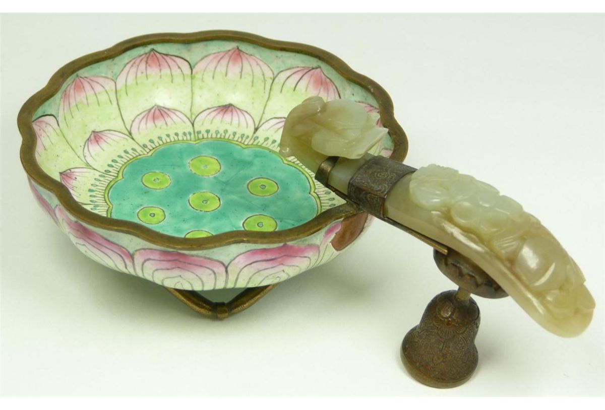 Old Chinese enameled copper bowl having a lotus blossom figural design with relief carved jade dragon scepter handle. Translucent green jade design with some russet color. Holds China mark to bottom. Republic period. Measures 2 1/4" height x 5 3/4" length (5.7cm x 14.6cm). Total weight of 148 grams.