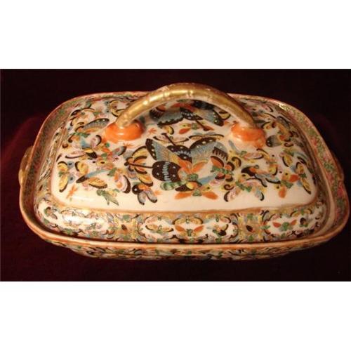 Circa 1820-1840 Chinese Export Rare and Unusual Covered Vegetable Dish. This is a Very Rare Form in Chinese Export Porcelain and this is the Finest and Most Exquisite piece of 1000 Black Butterfly that we have seen. It measures 13" from gilded handle to gilded handle on the sides. It is 9" in width from back to front and is 3" deep and 6 1/2" to the top of the handle of the exquisite cover. This pattern has the most dynamic painted butterflies and roses that I have seen in this pattern. It is simply a Exquisite Piece. The Most Unusual piece of Butterfly thht we have seen. Schiffer's Book on Chinese Export Porcelain does not show any examples of this form. Over the years I have seen three in this form--This is #4. Excellent Condition. Good Quality. No Chips, Cracks or Restoration.