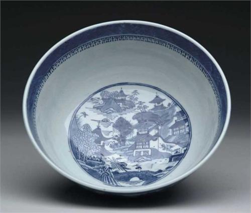 CHINESE EXPORT BLUE AND WHITE BOWL. Blue scenic decoration in the Canton style. Second quarter of the 19th Century. SIZE: 10-3/4” dia x 4-1/2” h. CONDITION: Very good. 9-26657